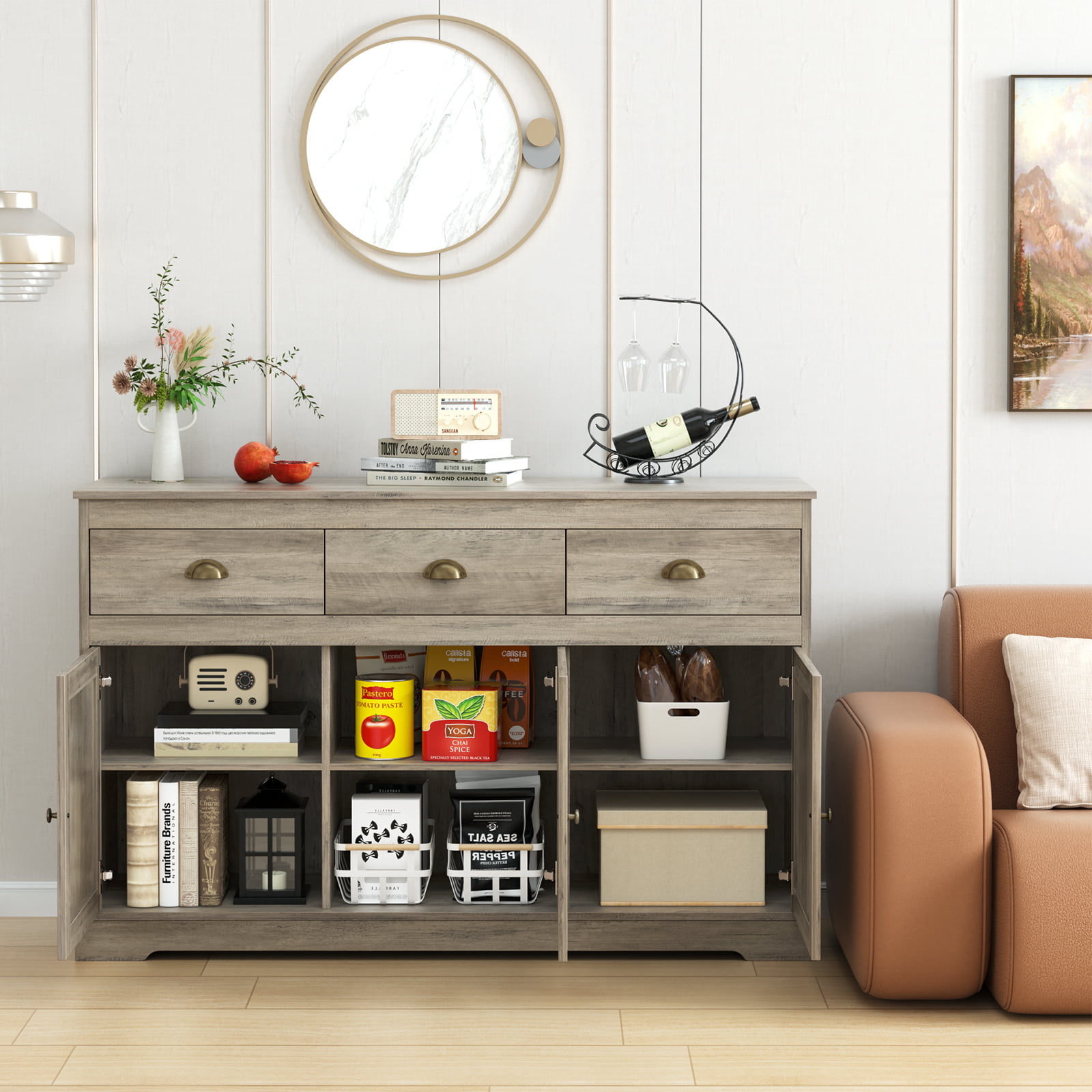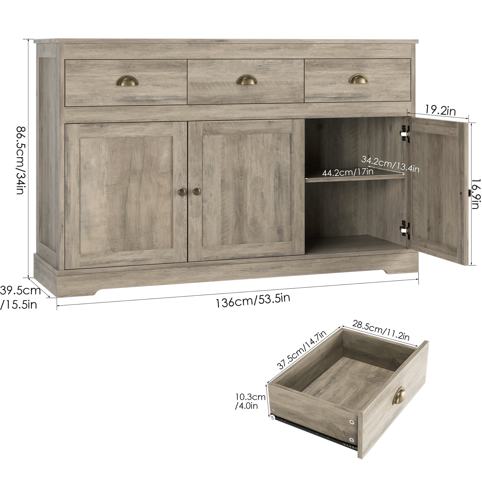 Homfa Sideboard Storage Cabinet with 3 Drawers & 3 Doors. 53.54” Wide Buffet Cabinet for Dining Room. Gray