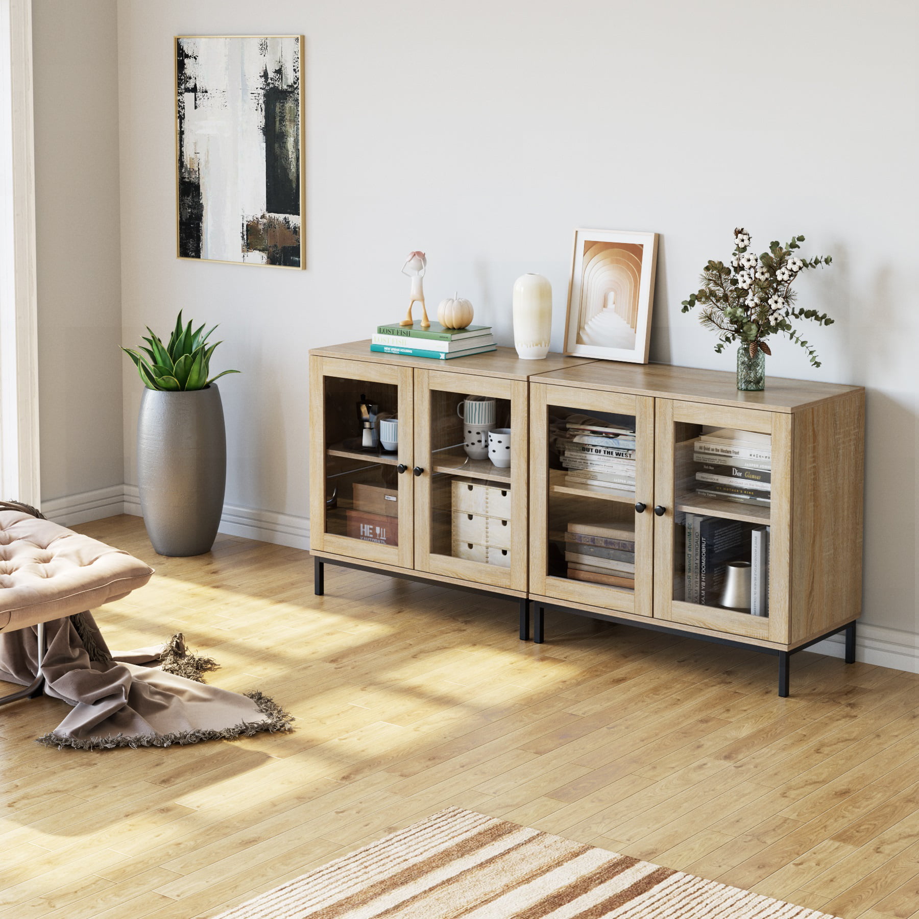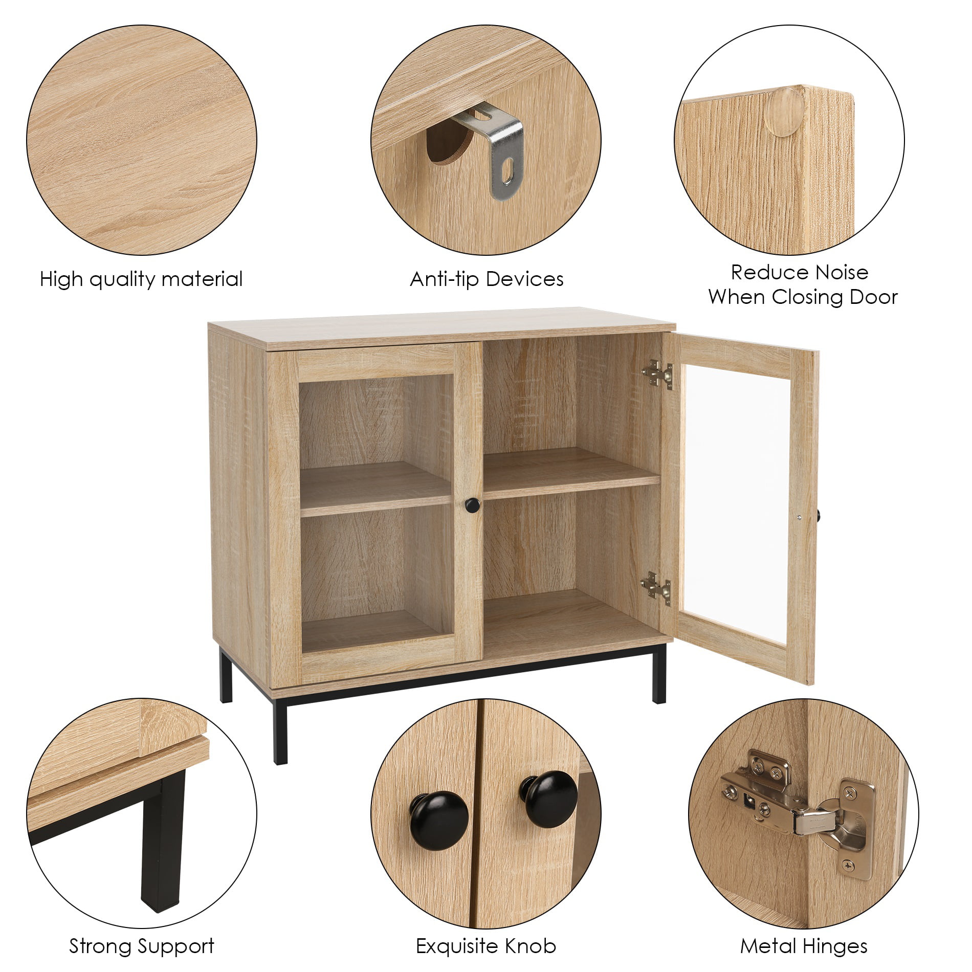 Homfa Wide Accent Cabinet with Glass Doors. Adjustable Shelves Display Cabinet with Metal Base. Oak