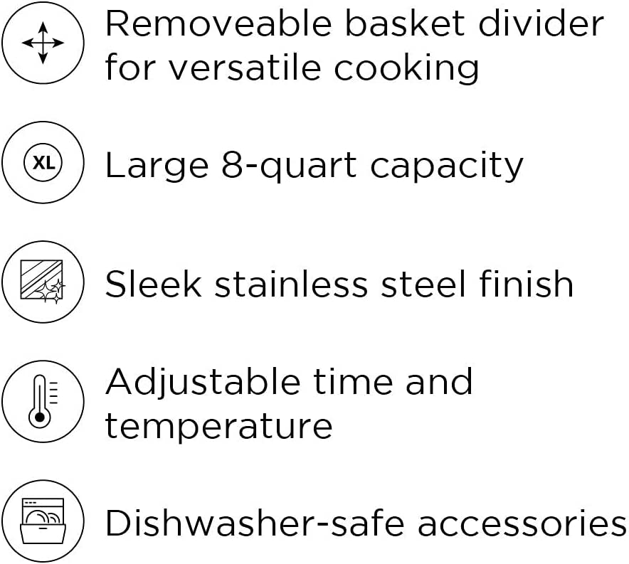 CHEFMAN 2 in 1 Max XL 8 Qt Air Fryer. Healthy Cooking. User Friendly. Basket Divider For Dual Cooking. Nonstick Stainless Steel. Digital Touch Screen with 4 Cooking Functions. BPA-Free