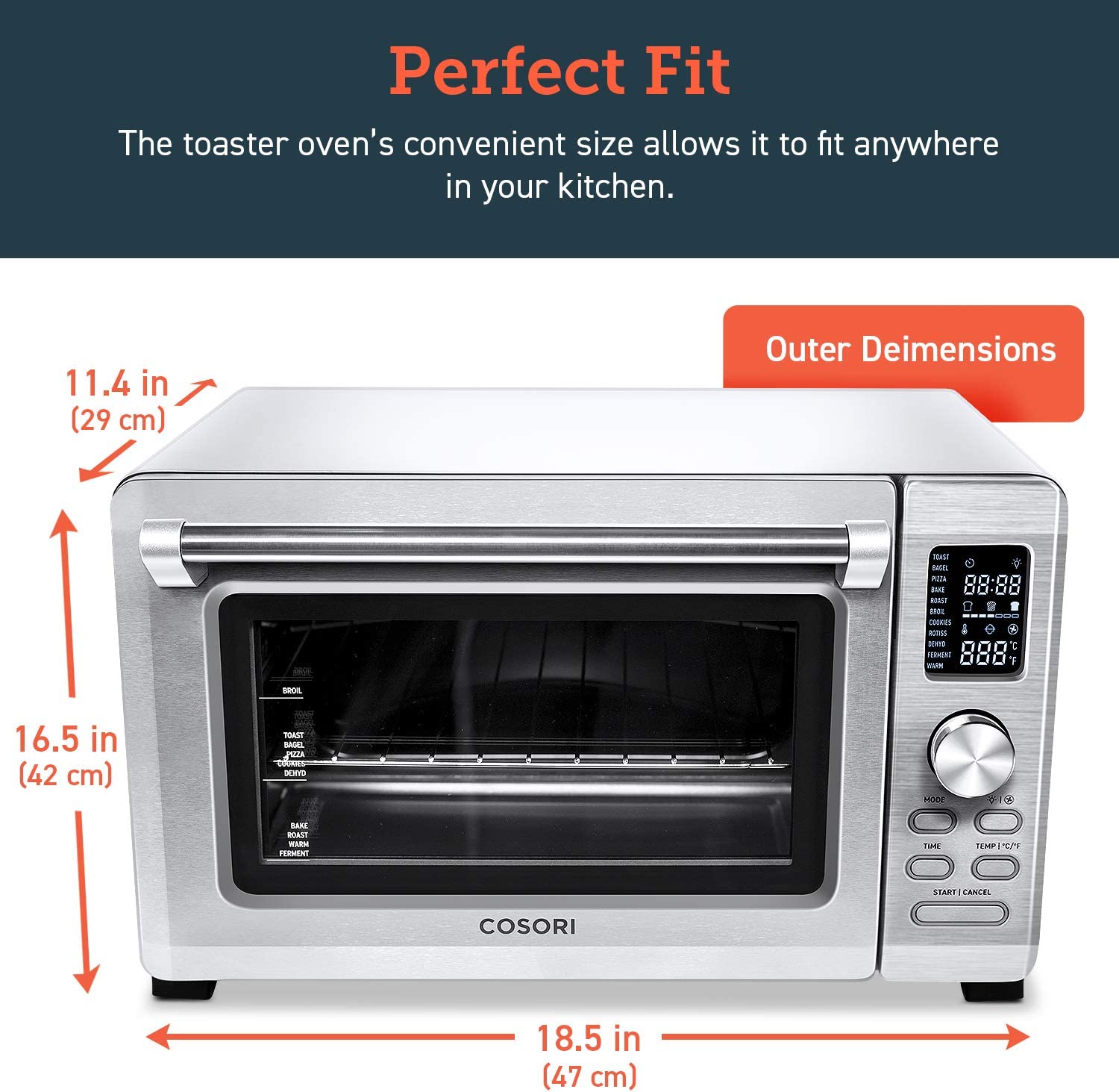 COSORI Toaster Oven. 11-in-1 Convection ovens countertop. Rotisserie & Dehydrator. 12 inch pizza . 52 Recipes & 5 Accessories. CO125-TO. 26.4QT. Stainless steel