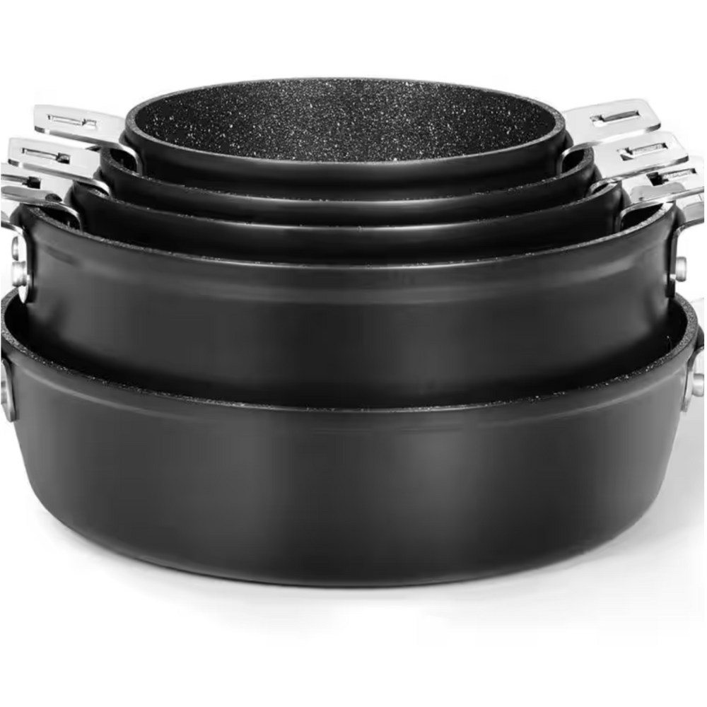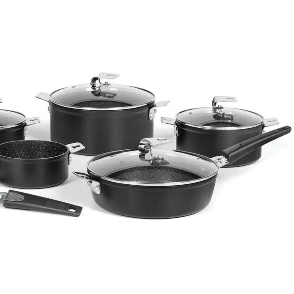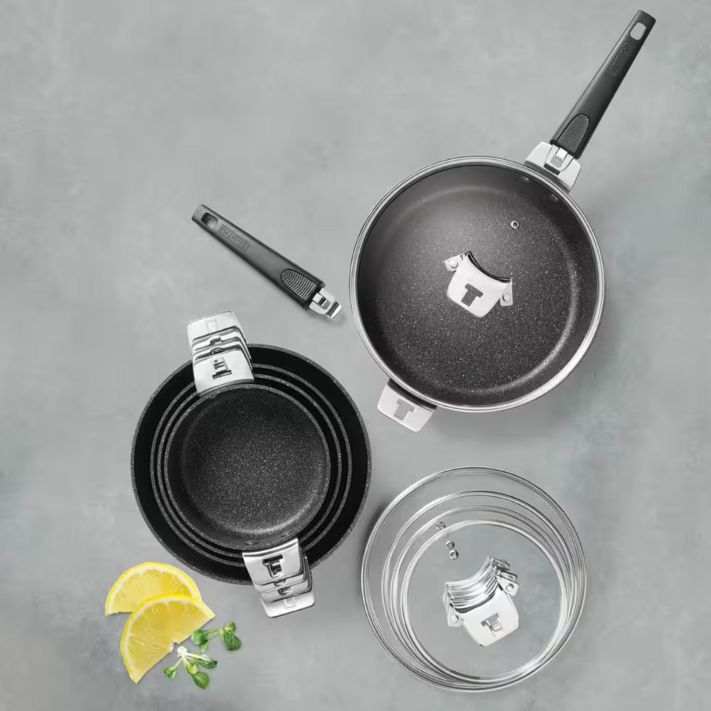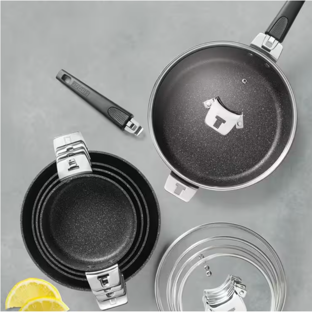 The Rock By Starfrit 12-Piece Aluminum Space-Saving Cookware Set with T-Lock Detachable Handles