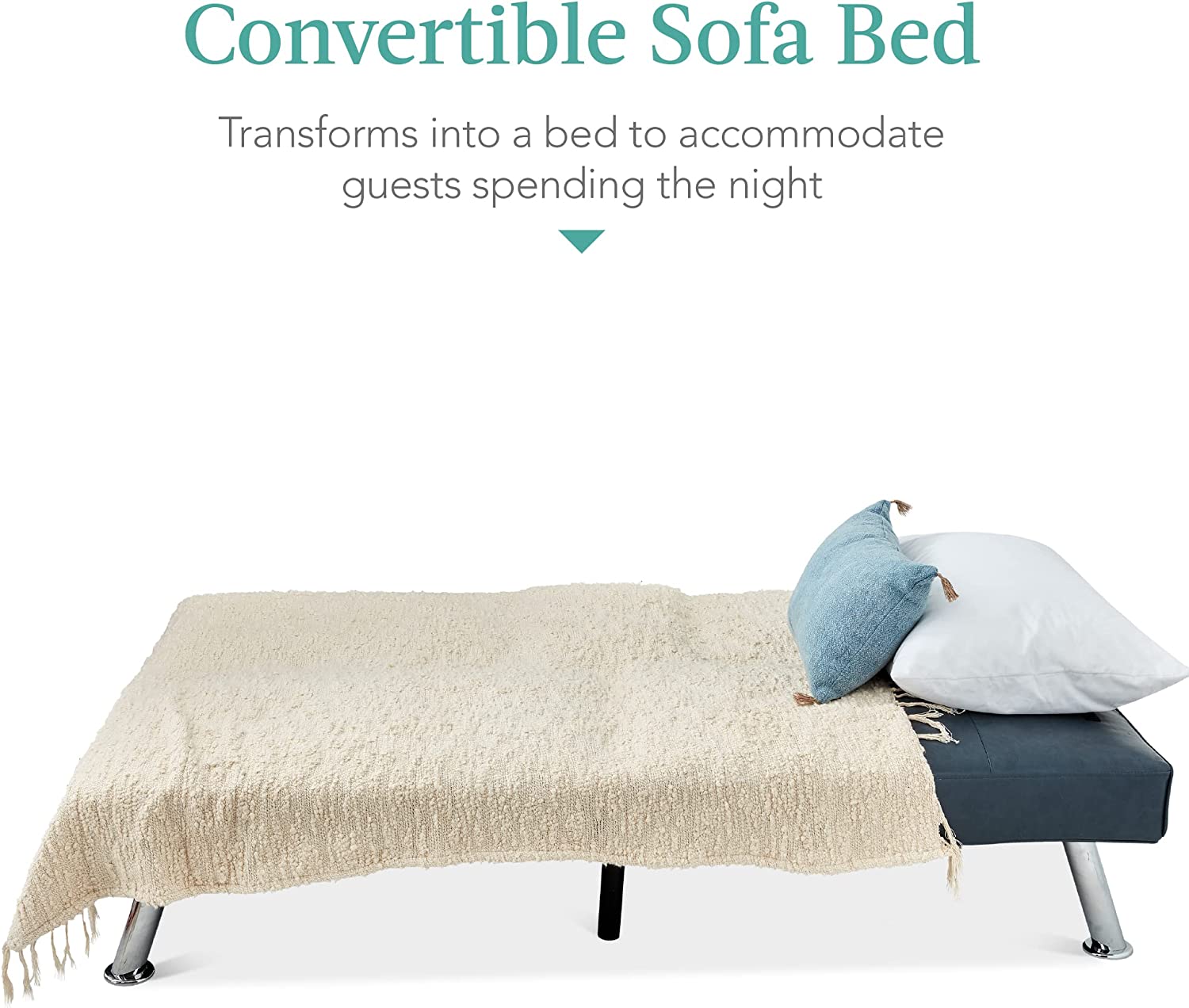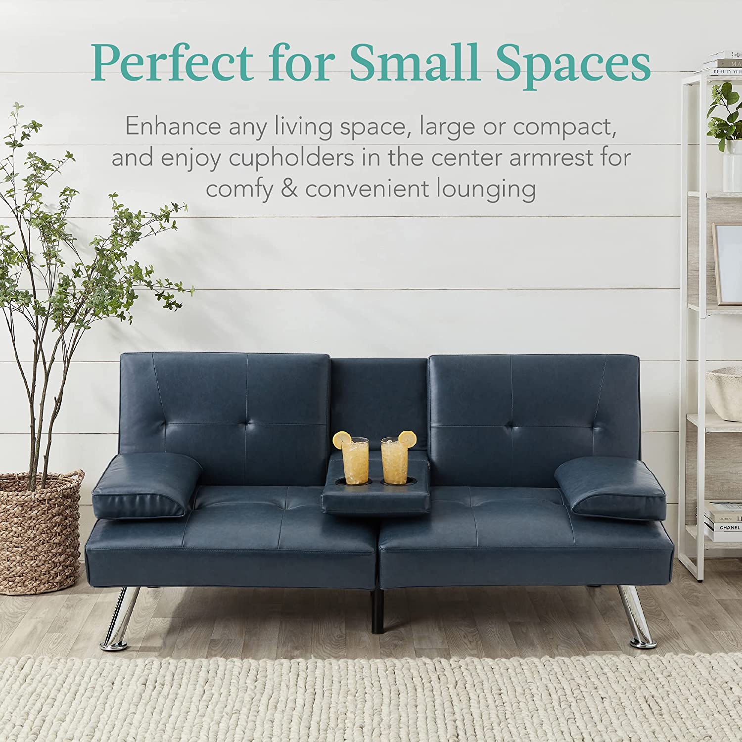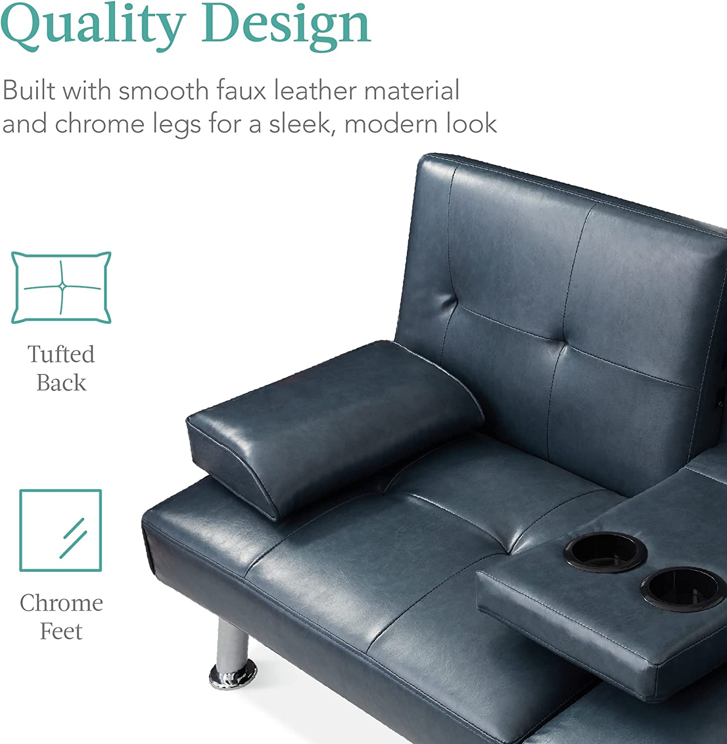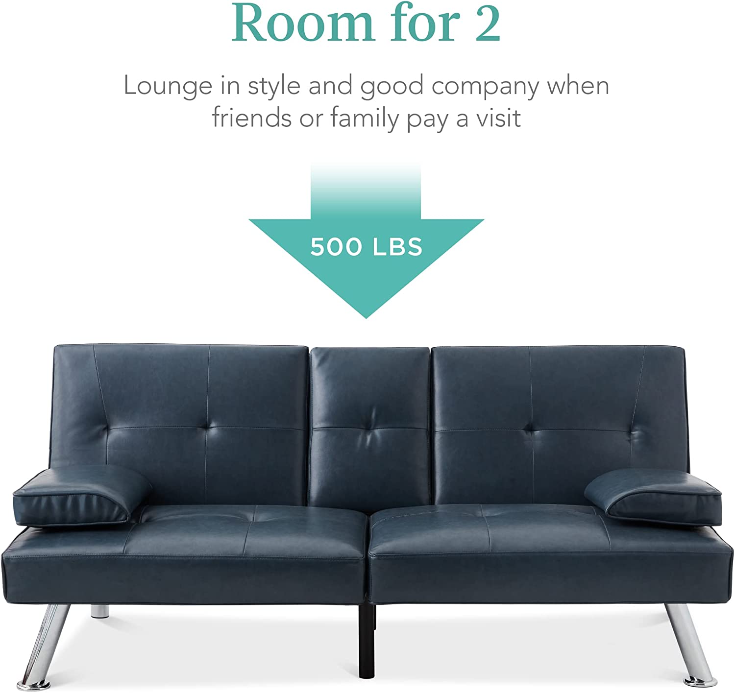 Best Choice Products Faux Leather Upholstered Modern Convertible Folding Futon Sofa Bed for Compact Living Space. Apartment. Dorm. Bonus Room w/Removable Armrests. Metal Legs. 2 Cupholders - Blue