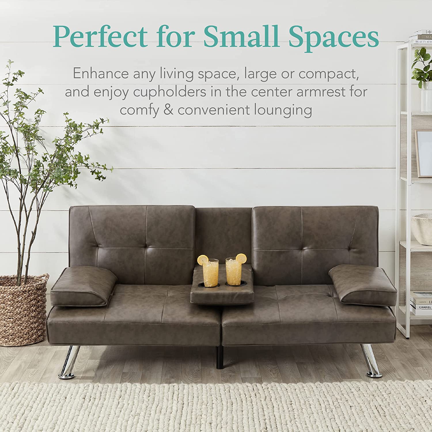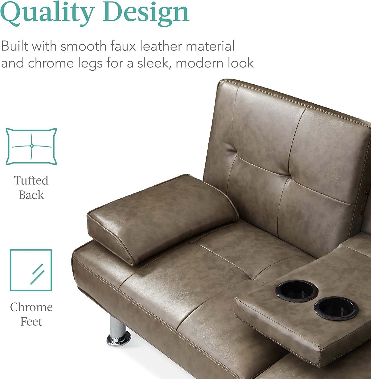 Best Choice Products Faux Leather Upholstered Modern Convertible Folding Futon Sofa Bed for Compact Living Space. Apartment. Dorm. Bonus Room w/Removable Armrests. Metal Legs. 2 Cupholders - Gray