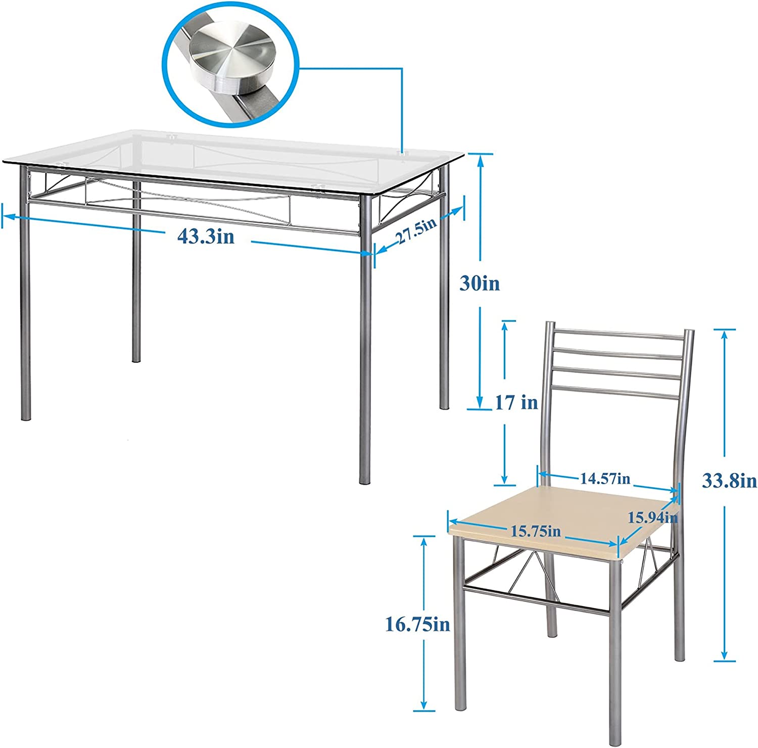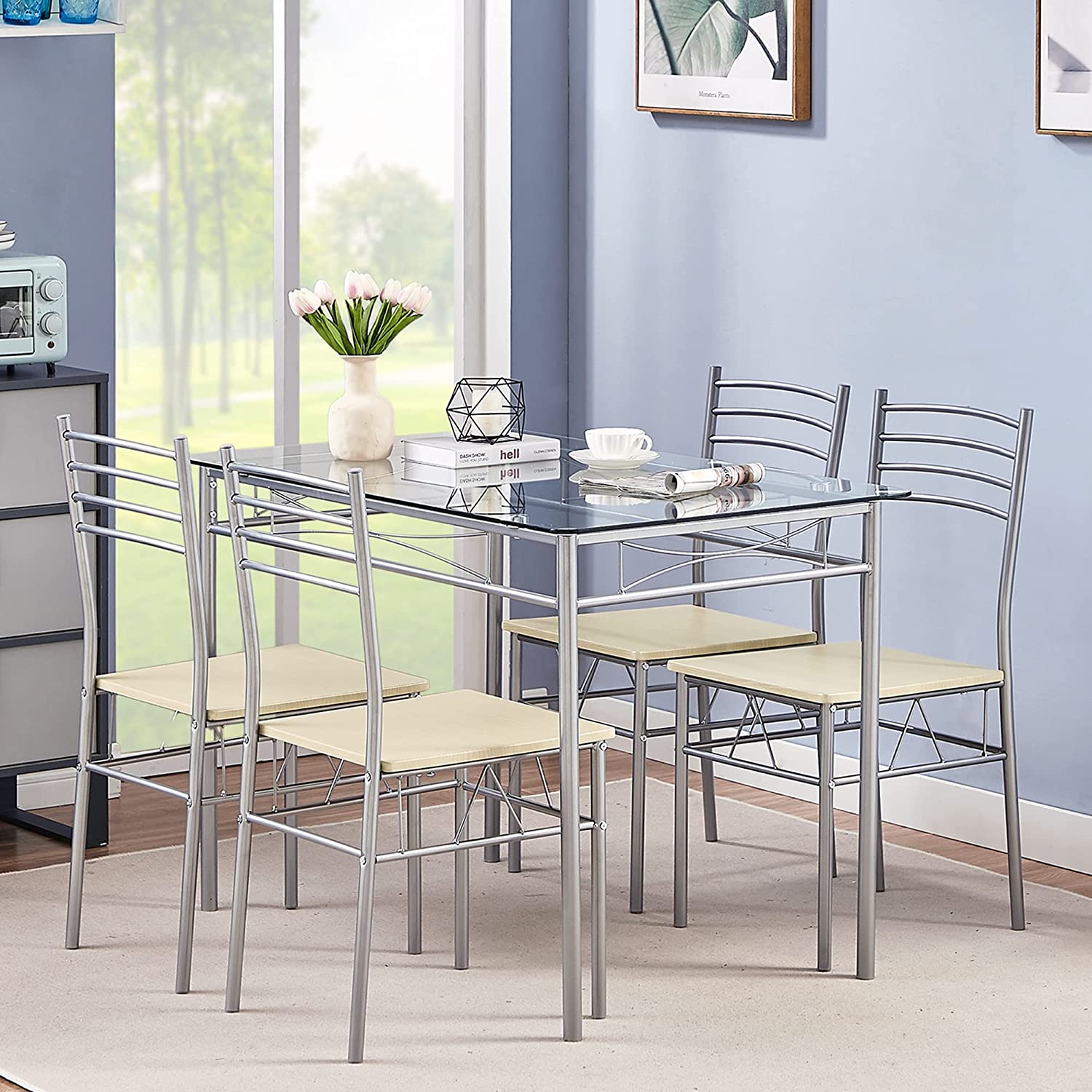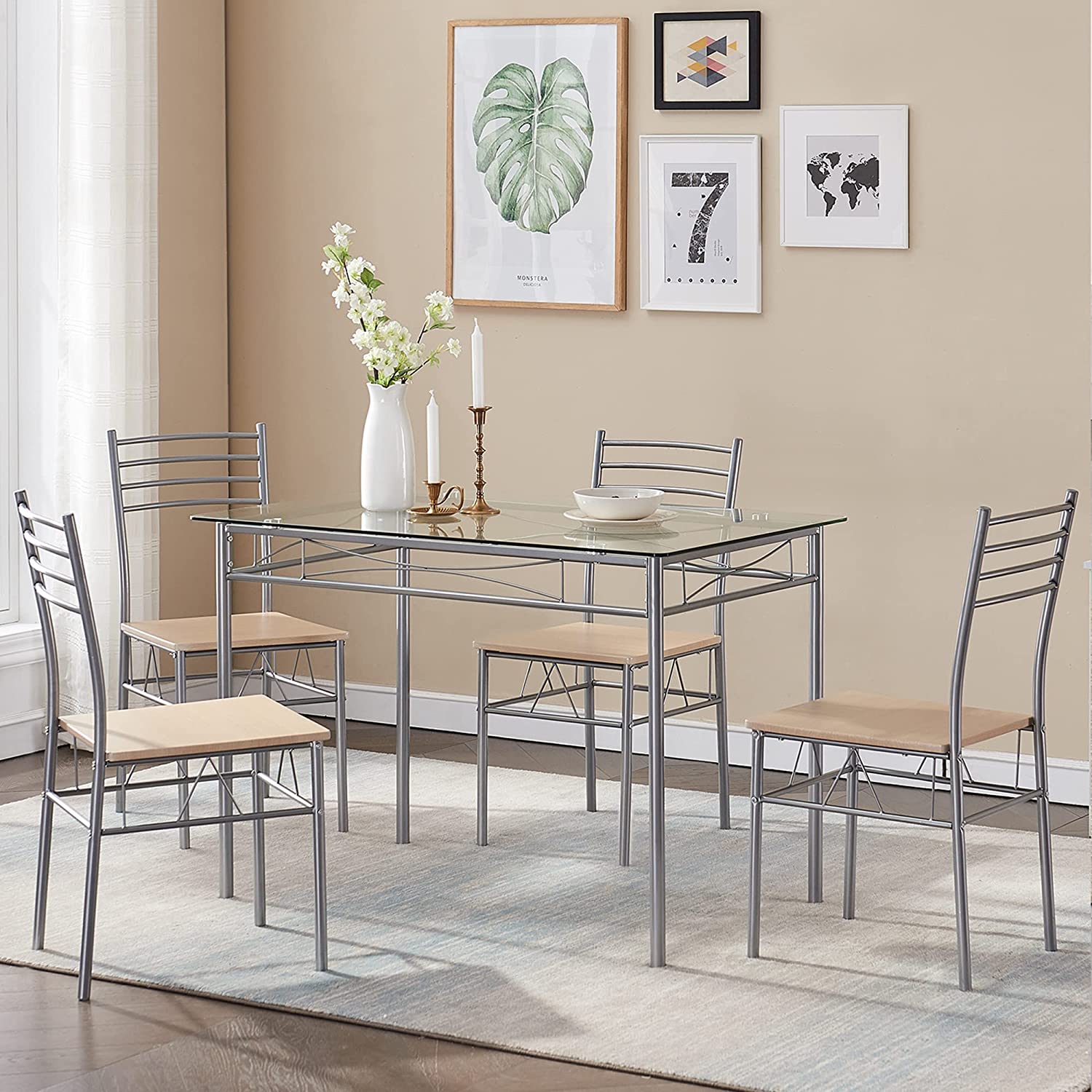 VECELO Kitchen Dining Room Table and Chairs 4. 5-Piece Dinette Sets. Space Saving (Silver). Silvery