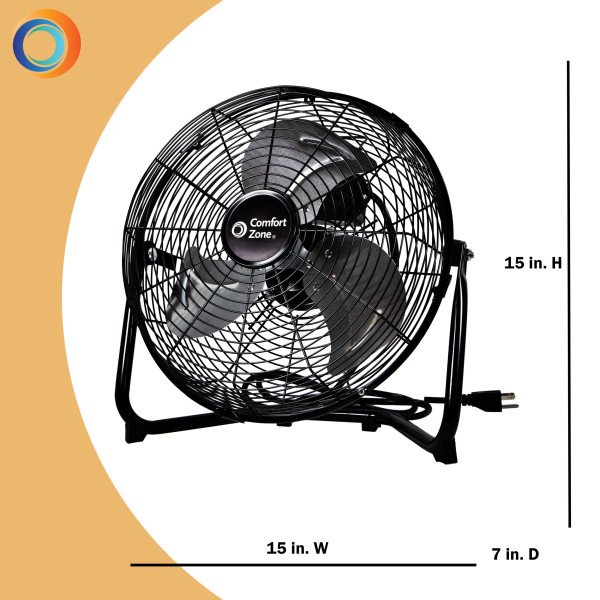 Comfort Zone 12 3-Speed Cradle/Floor Fan with 180-Degree Adjustable Tilt. All-Metal Construction. Rubber Feet. and Carry Handle. Black