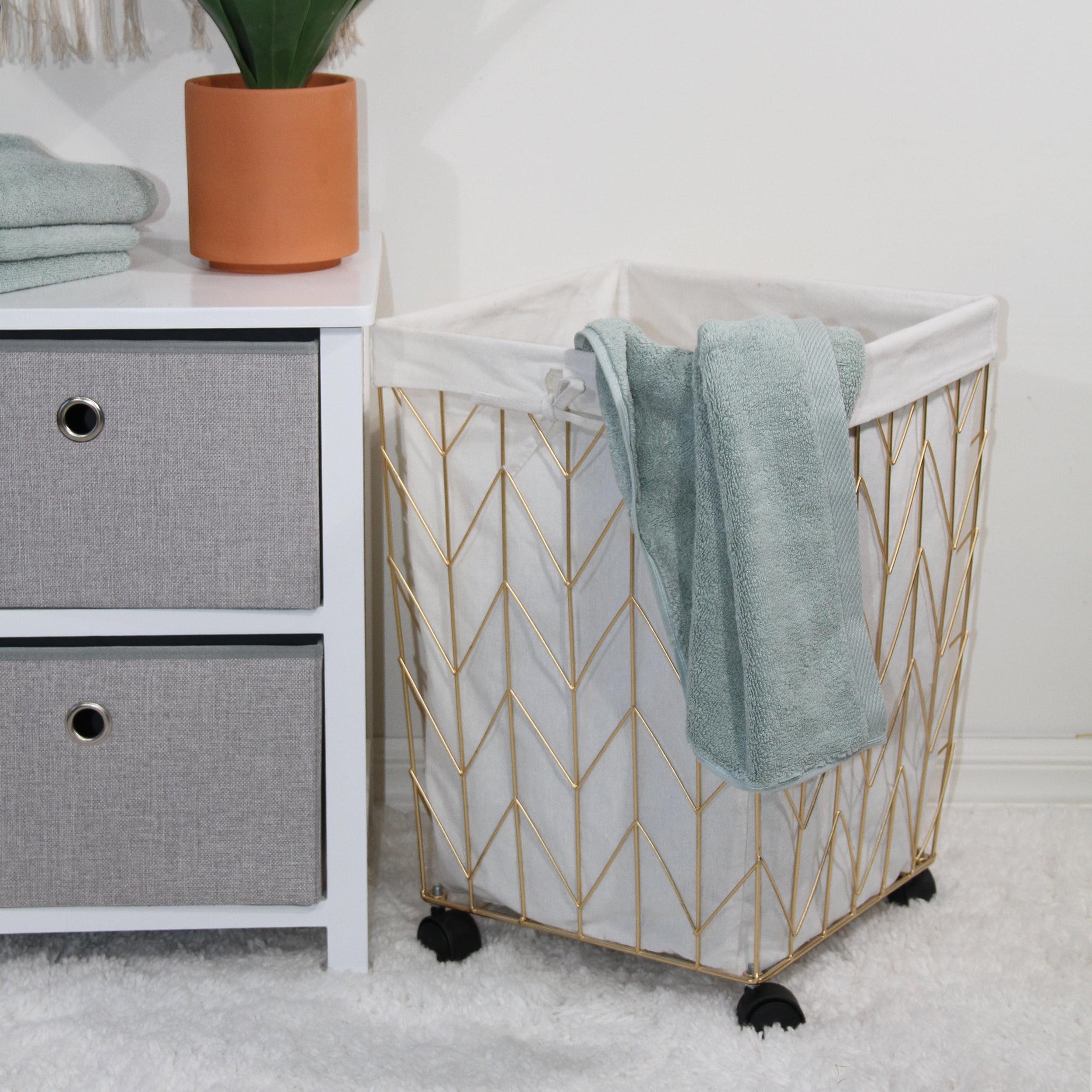 Mainstays Square Chevron Pattern Metal Laundry Hamper with Wheels. Gold & Natural