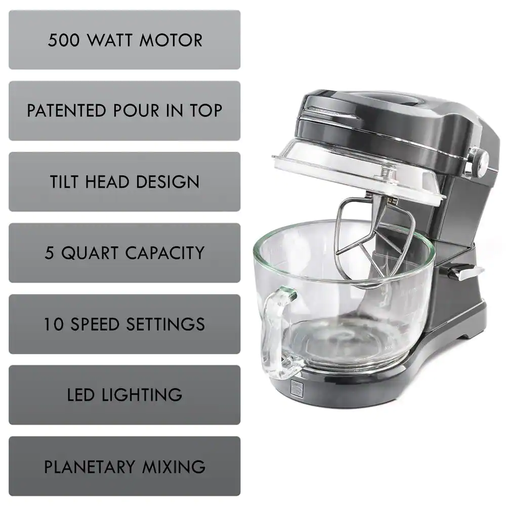 Kenmore Elite Ovation 5 Qt Stand Mixer. 500W 10-Speed. Pour-In Top. Beater. Whisk. Dough Hook. Grey