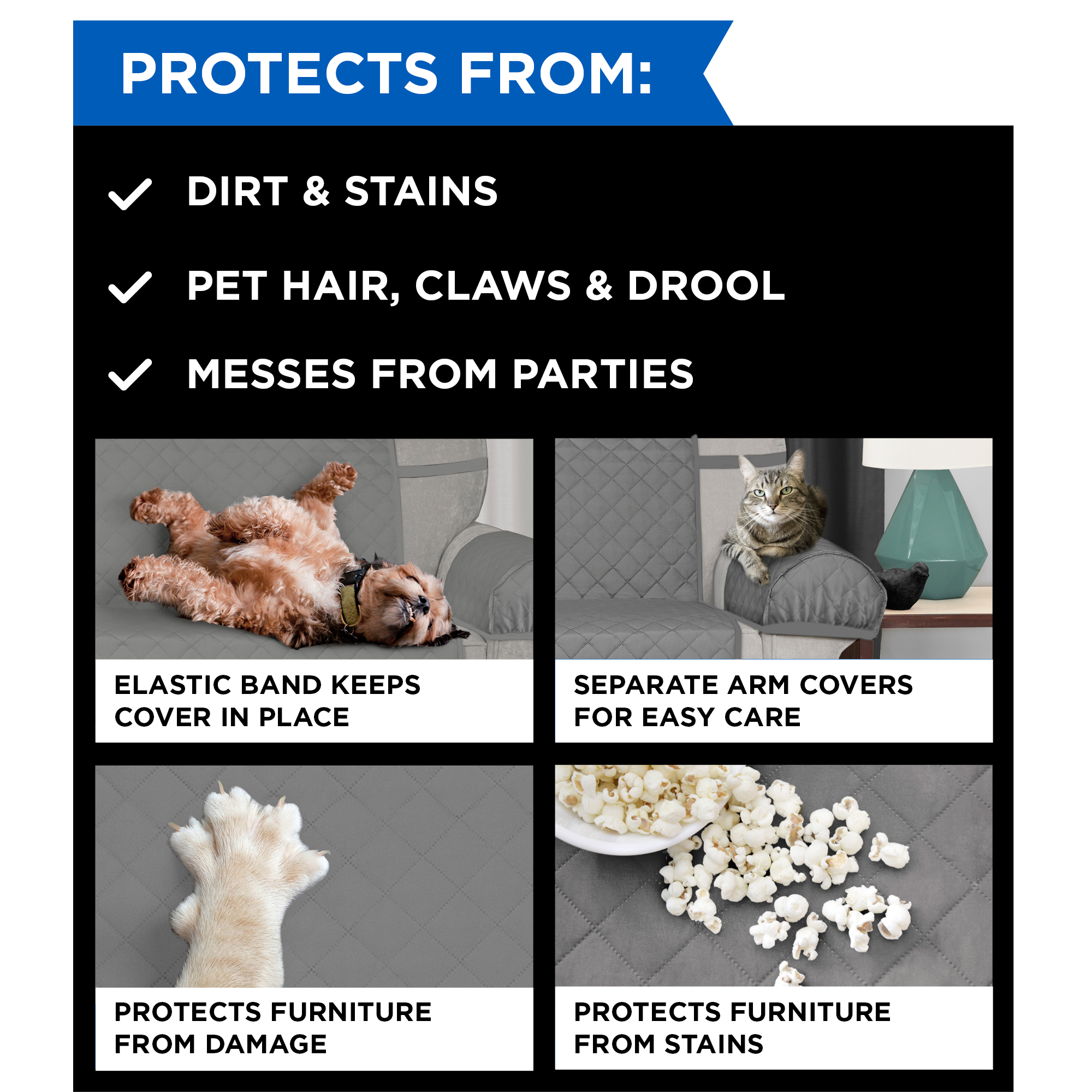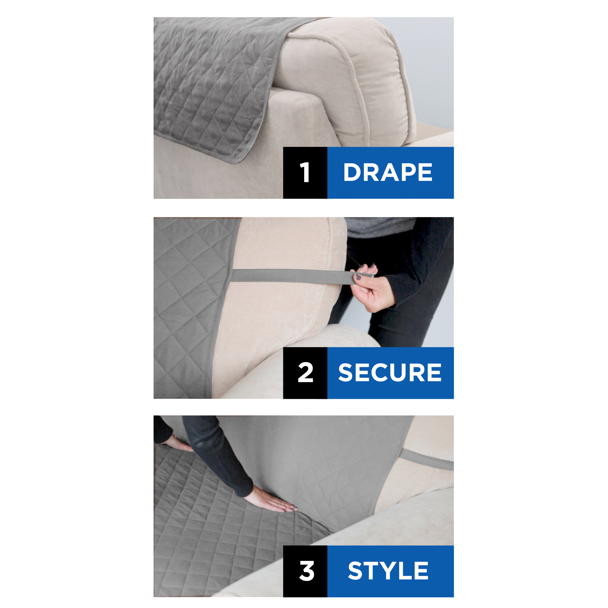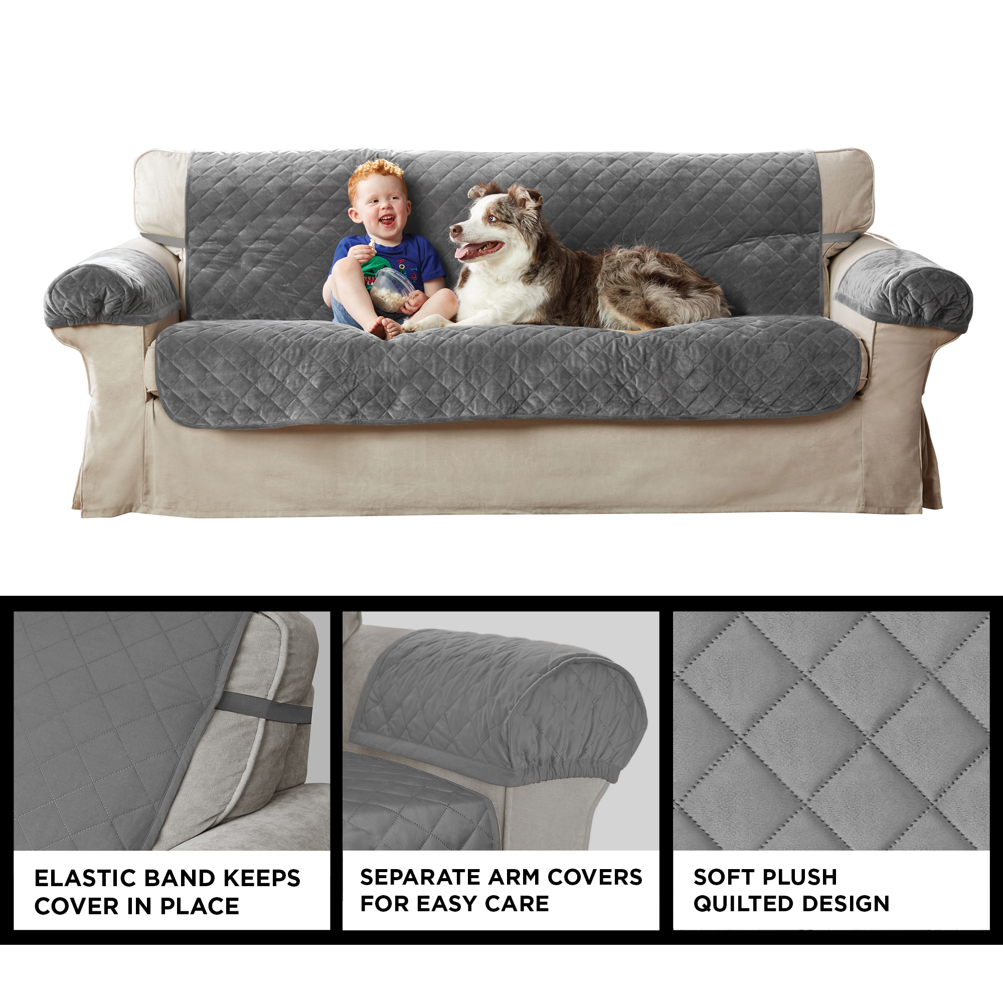 Mainstays Sofa Quilted Plush Fabric Pet Cover Multipurpose Furniture Protector. Gray. 3-Piece