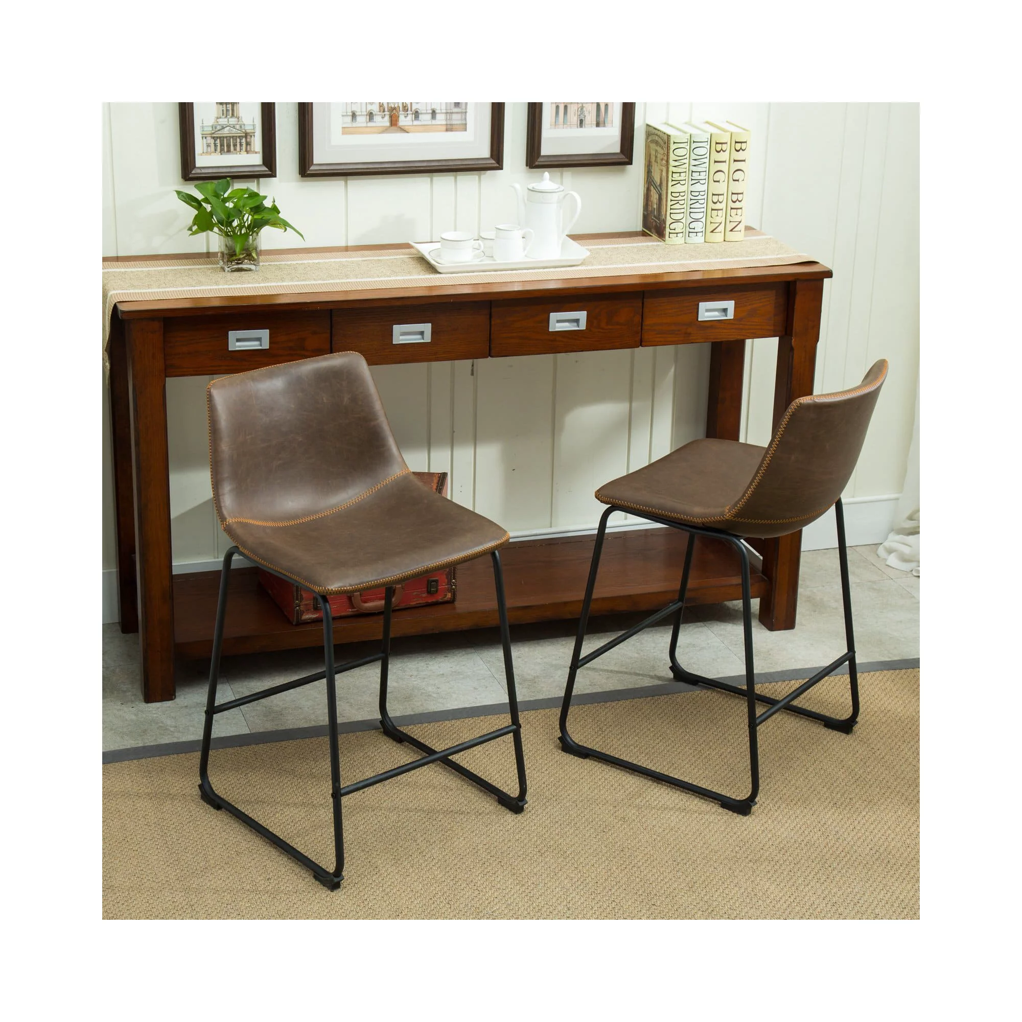 Roundhill Furniture Lotusville Vintage PU Leather Counter Height Stools. Antique Brown. Set of 2
