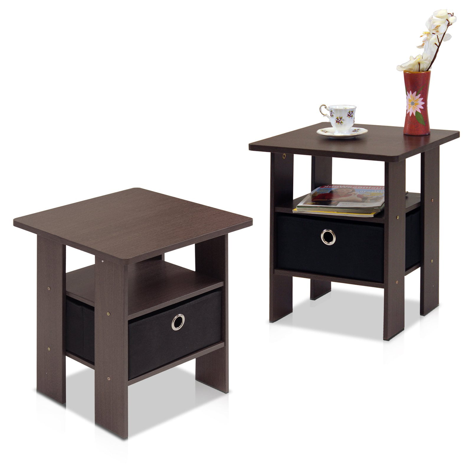 Furinno Andrey End Table Nightstand with Bin Drawer. Set of 2. Dark Brown