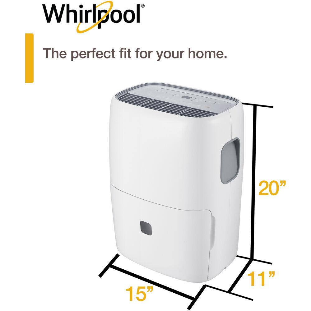 Whirlpool WHAD501CW 50-Pint Portable Dehumidifier with 24-Hour Timer. Auto Shut-Off. Easy-Clean Filter. Auto-Restart and Wheels