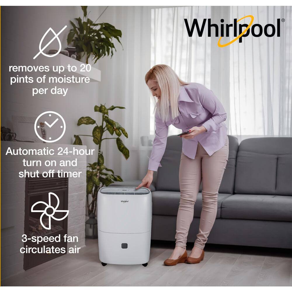 Whirlpool WHAD201CW 20-Pint Portable Dehumidifier with 24-Hour Timer. Auto Shut-Off. Easy-Clean Filter. Auto-Restart and Wheels