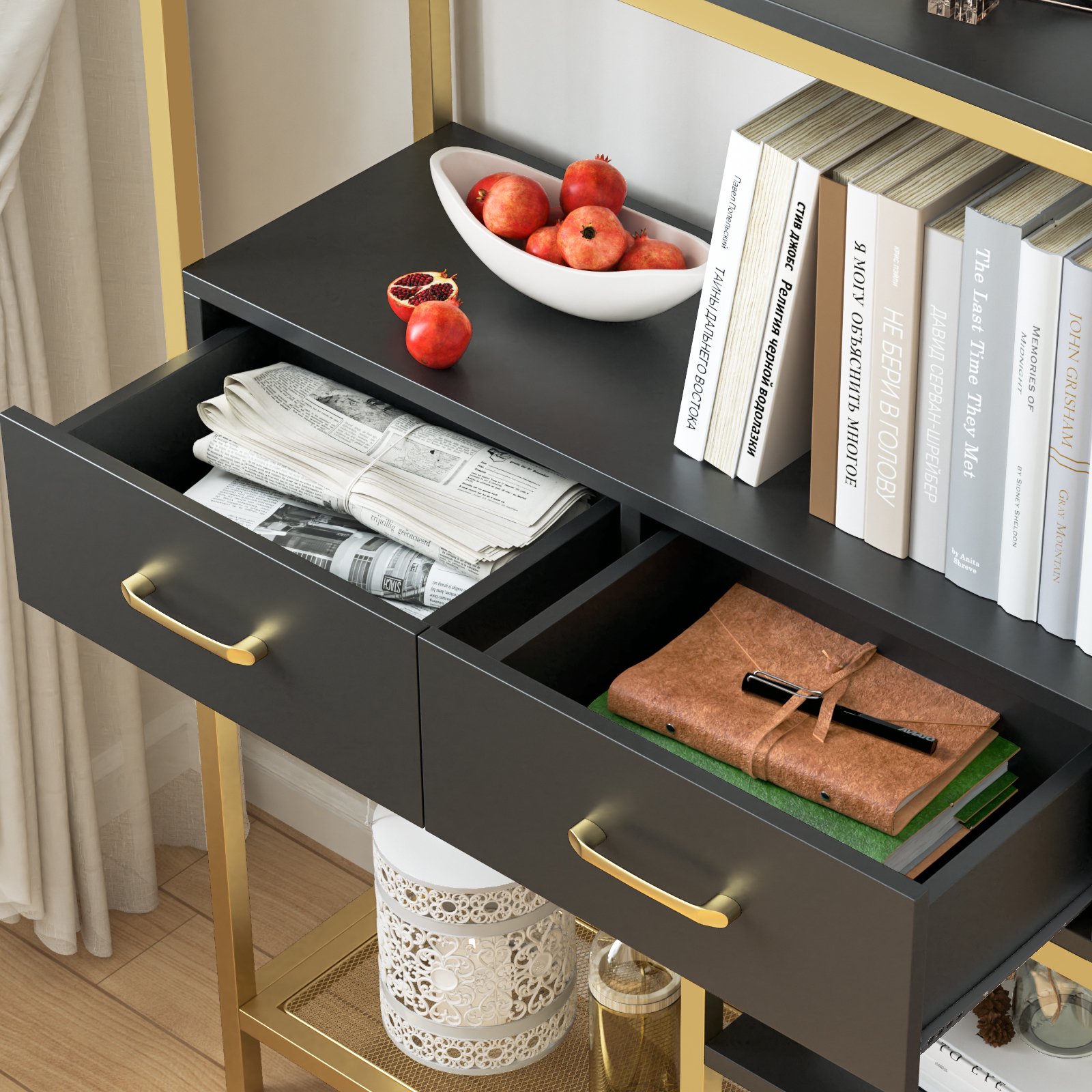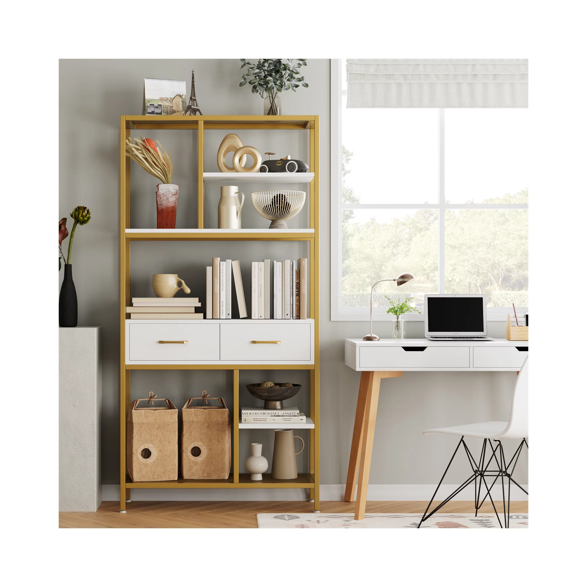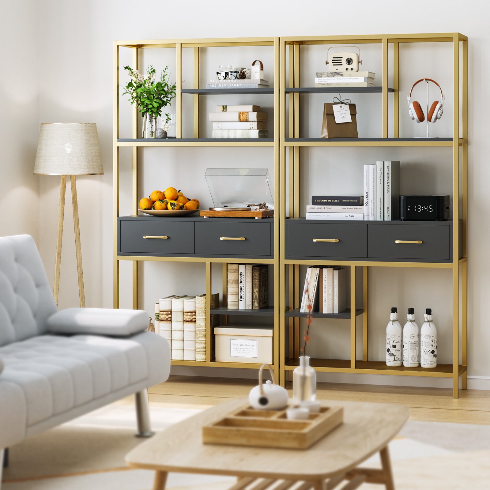 Homfa 5-tier Iron Bookcase with 2 Drawers. Industrial Tall Bookshelf with 7 open storage shelves. Free Standing Display shelf with Metal Frame. Black Gold