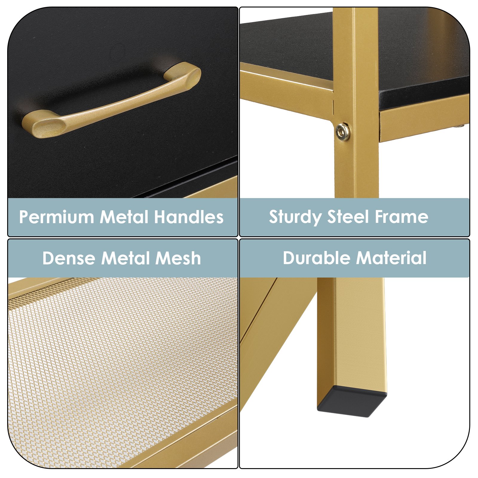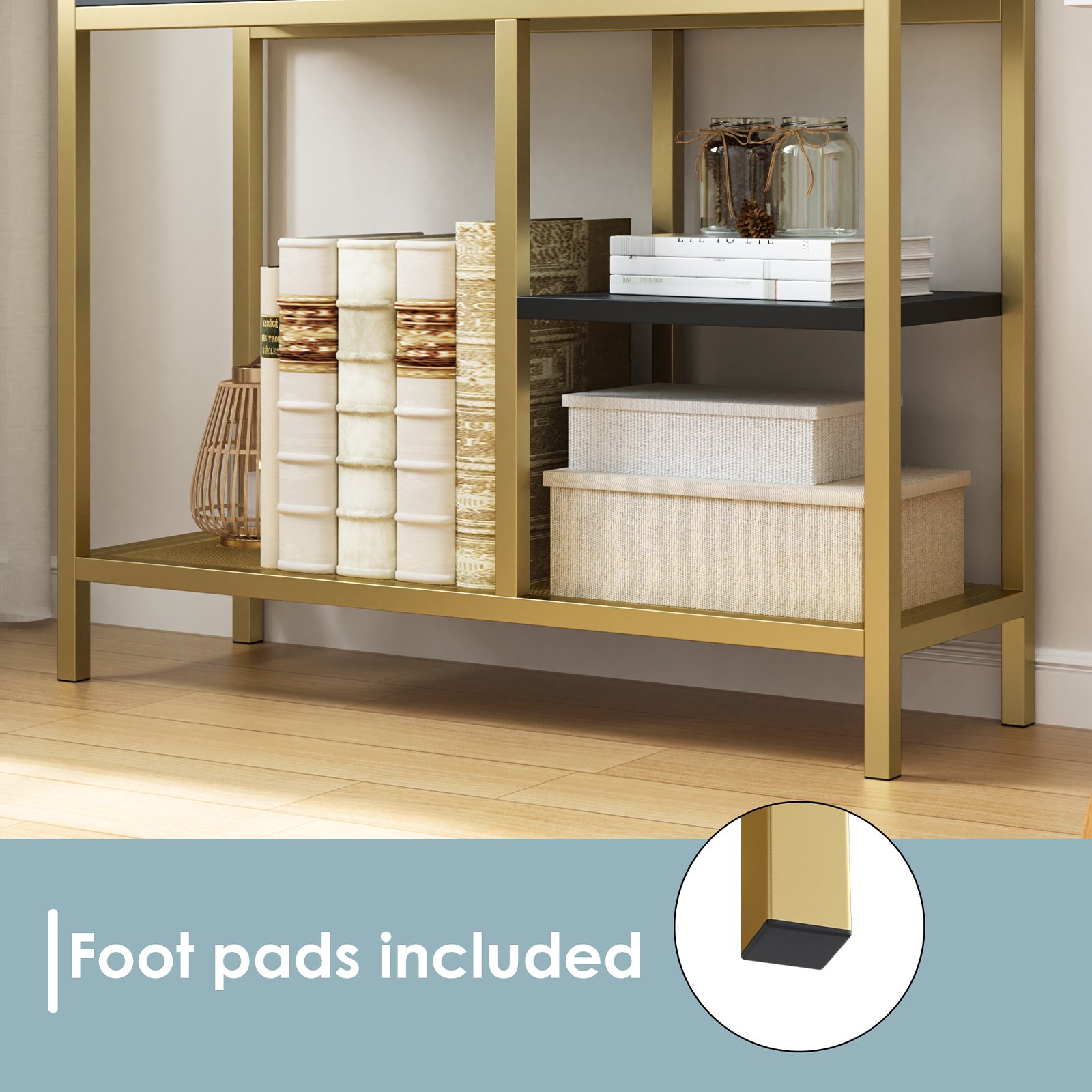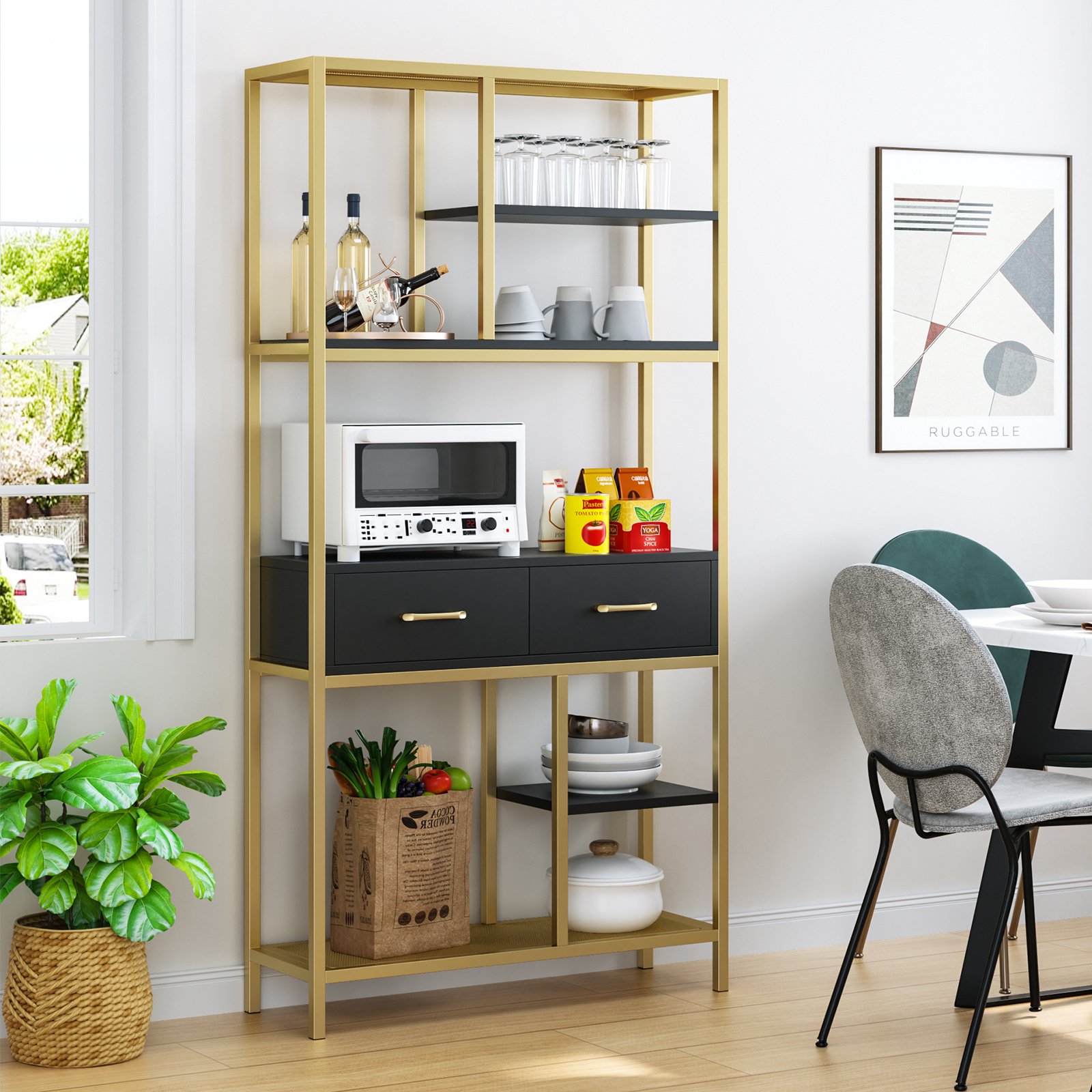 Homfa 5-tier Iron Bookcase with 2 Drawers. Industrial Tall Bookshelf with 7 open storage shelves. Free Standing Display shelf with Metal Frame. Black Gold