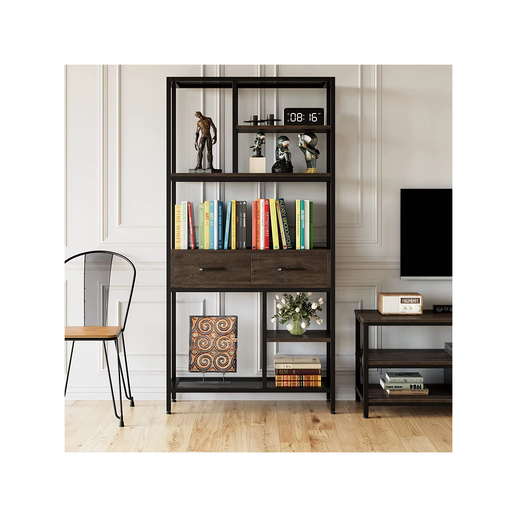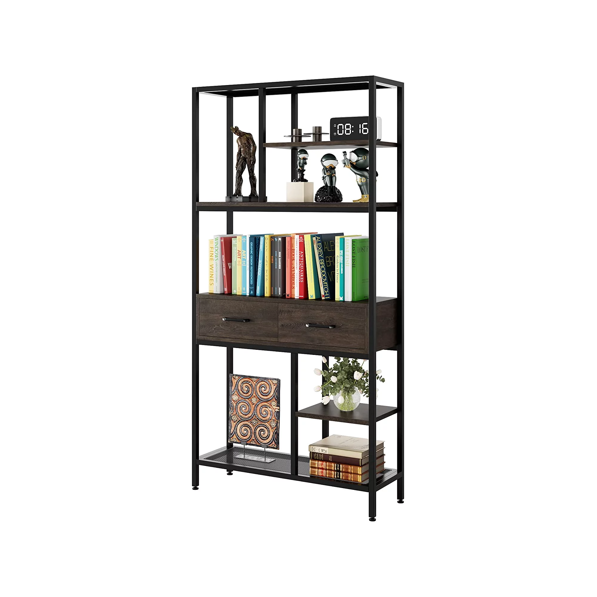 Homfa 5-tier Iron Bookcase with 2 Drawers. Industrial Tall Bookshelf with 7 open storage shelves. Free Standing Display shelf with Metal Frame. Dark Brown