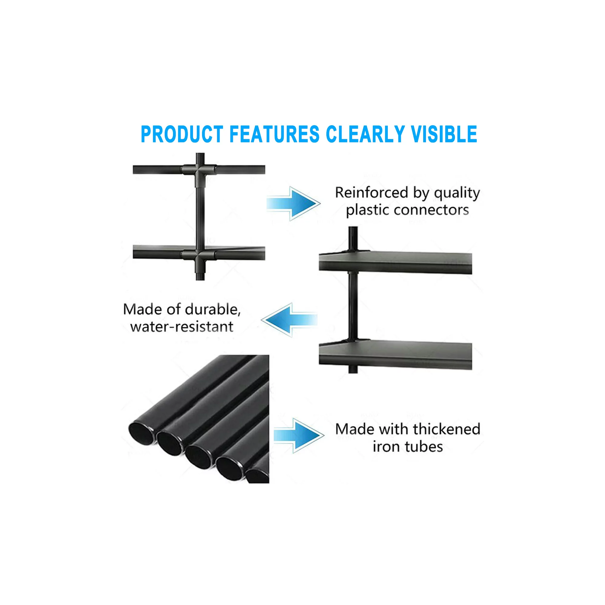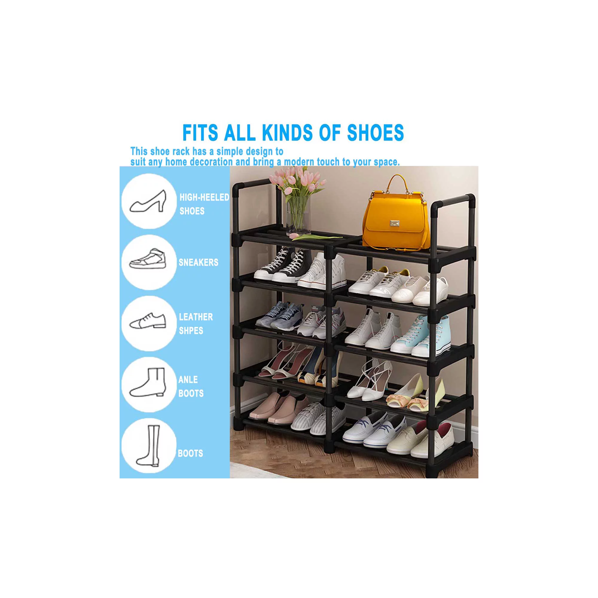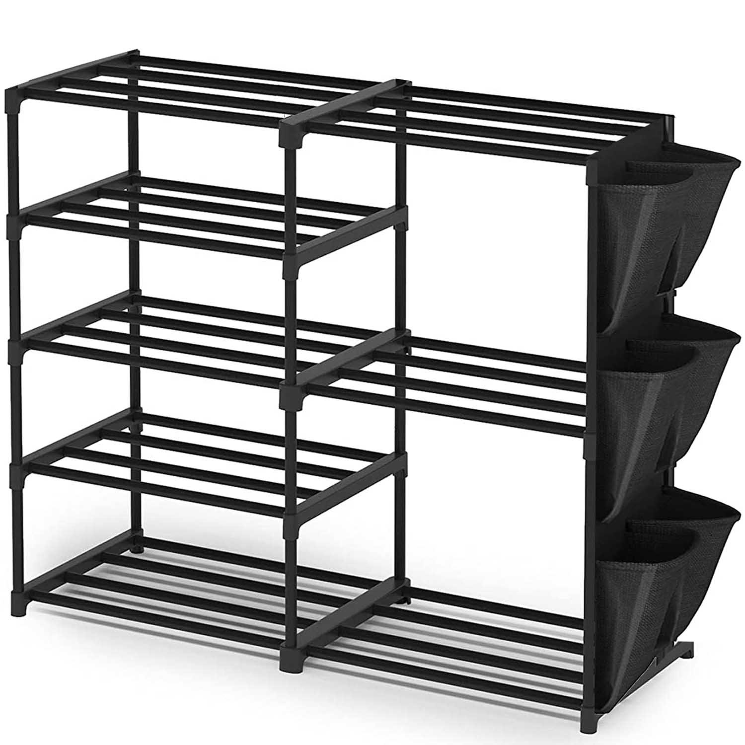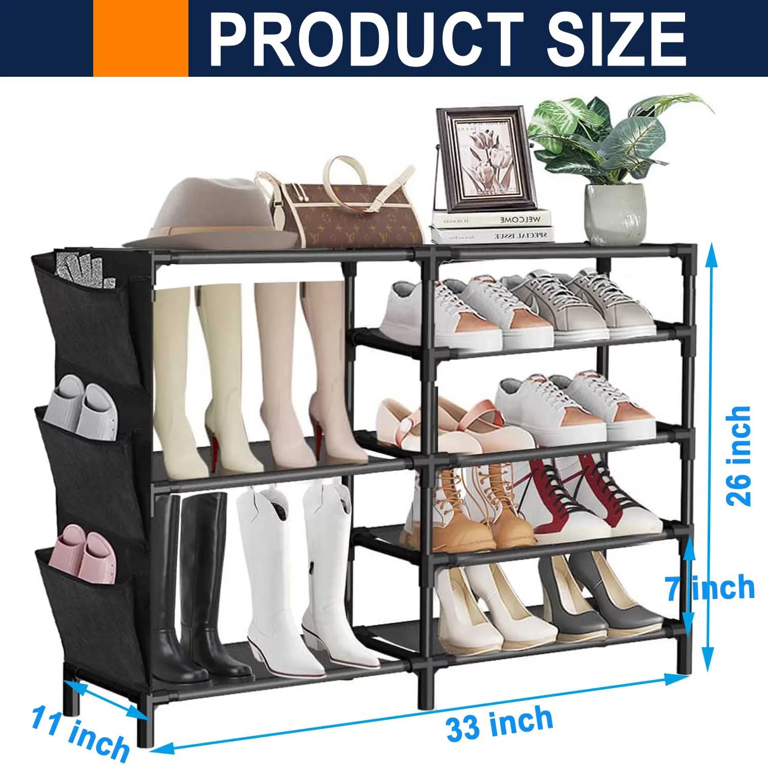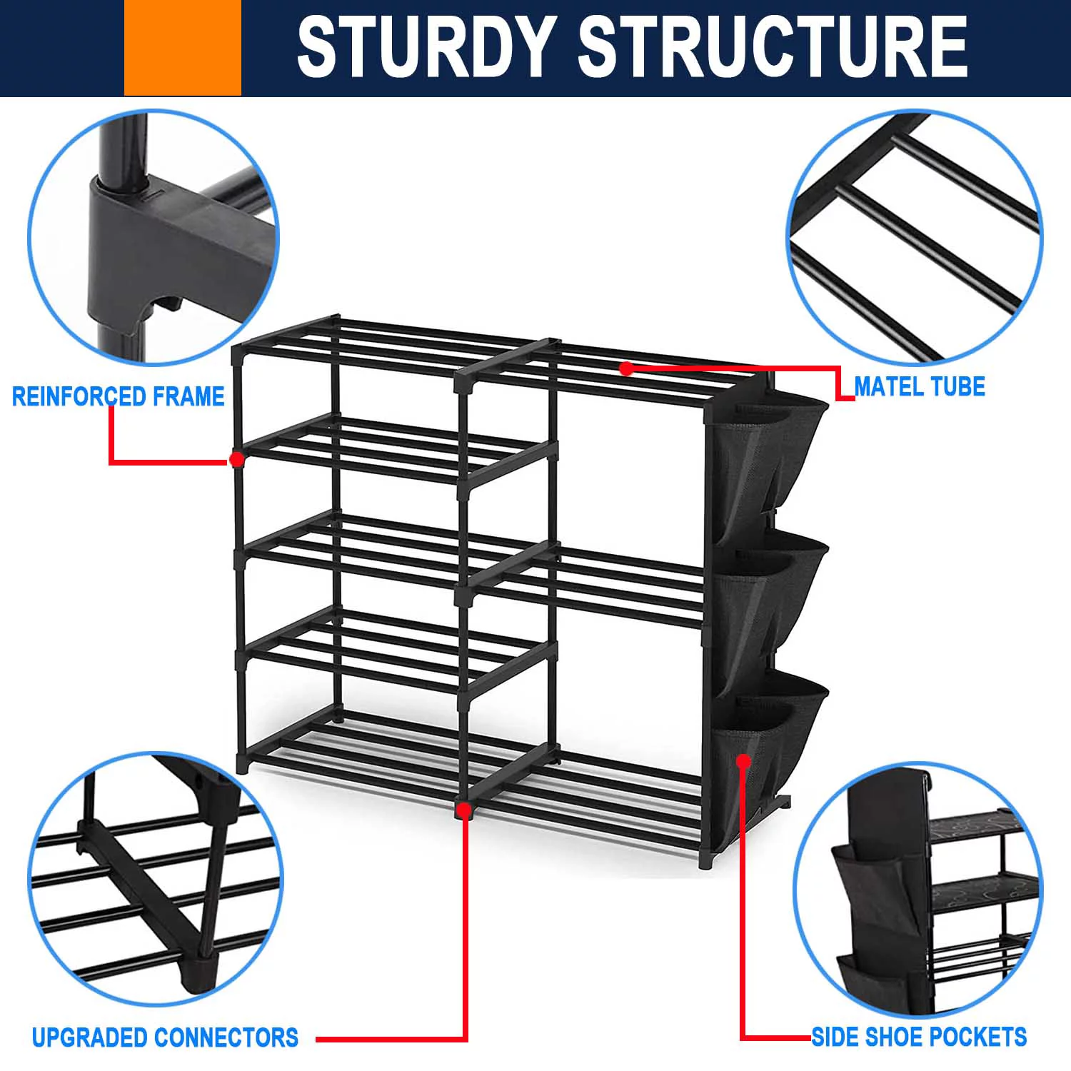 HKEEY Shoe Rack Storage Organizer. 5-Tier Durable Metal Shoe Rack with Side Hanging Pockets. Stackable Boots Shelf Organizer for 12-16 Pairs Shoes. Space Saving Shoe Cabinet