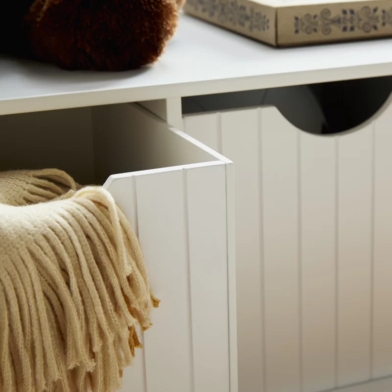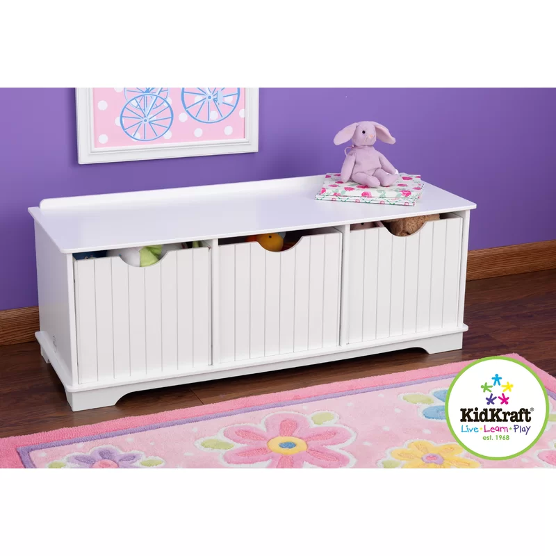 KidKraft Nantucket Wooden Storage Bench with Three Bins and Wainscoting Detail - White. Gift for Ages 3+