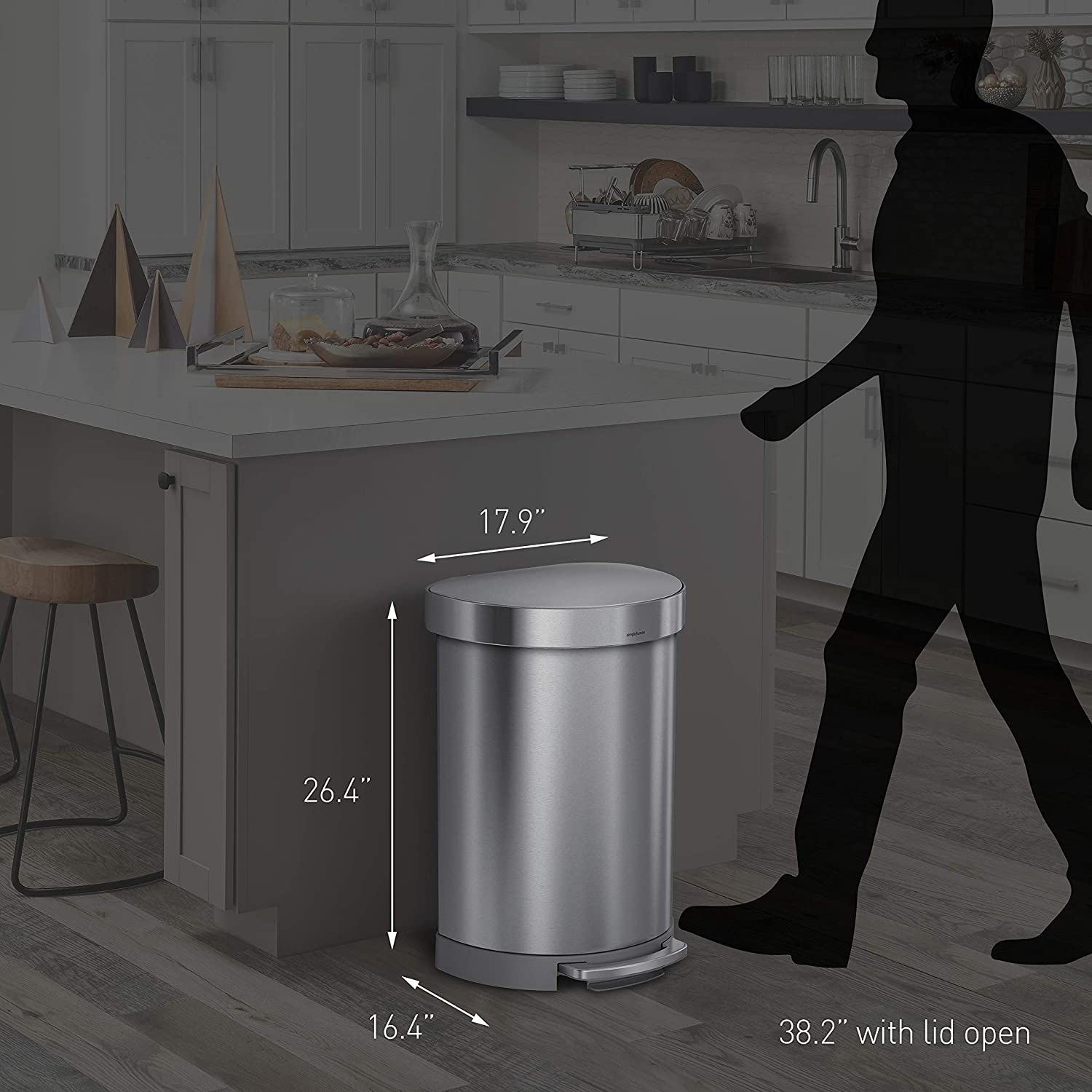 simplehuman 60 Liter Semi-Round Hands-Free Kitchen Step Trash Can with Soft-Close Lid. Brushed