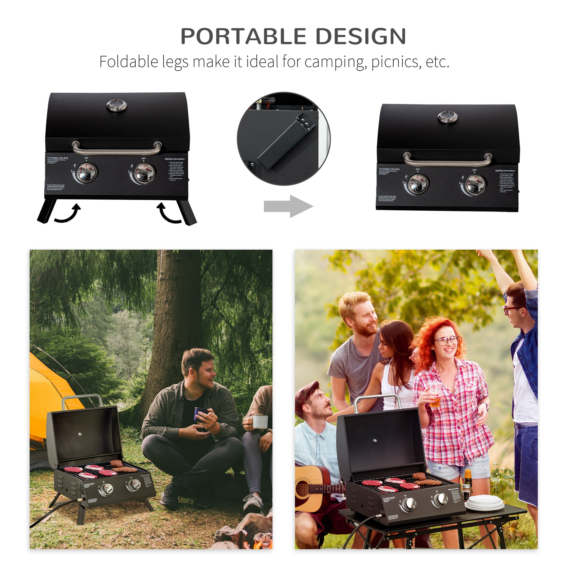 Outsunny 2 Burner Propane Gas Grill Outdoor Portable Tabletop BBQ with Foldable Legs. Lid. Thermometer for Camping. Picnic. Backyard. Black