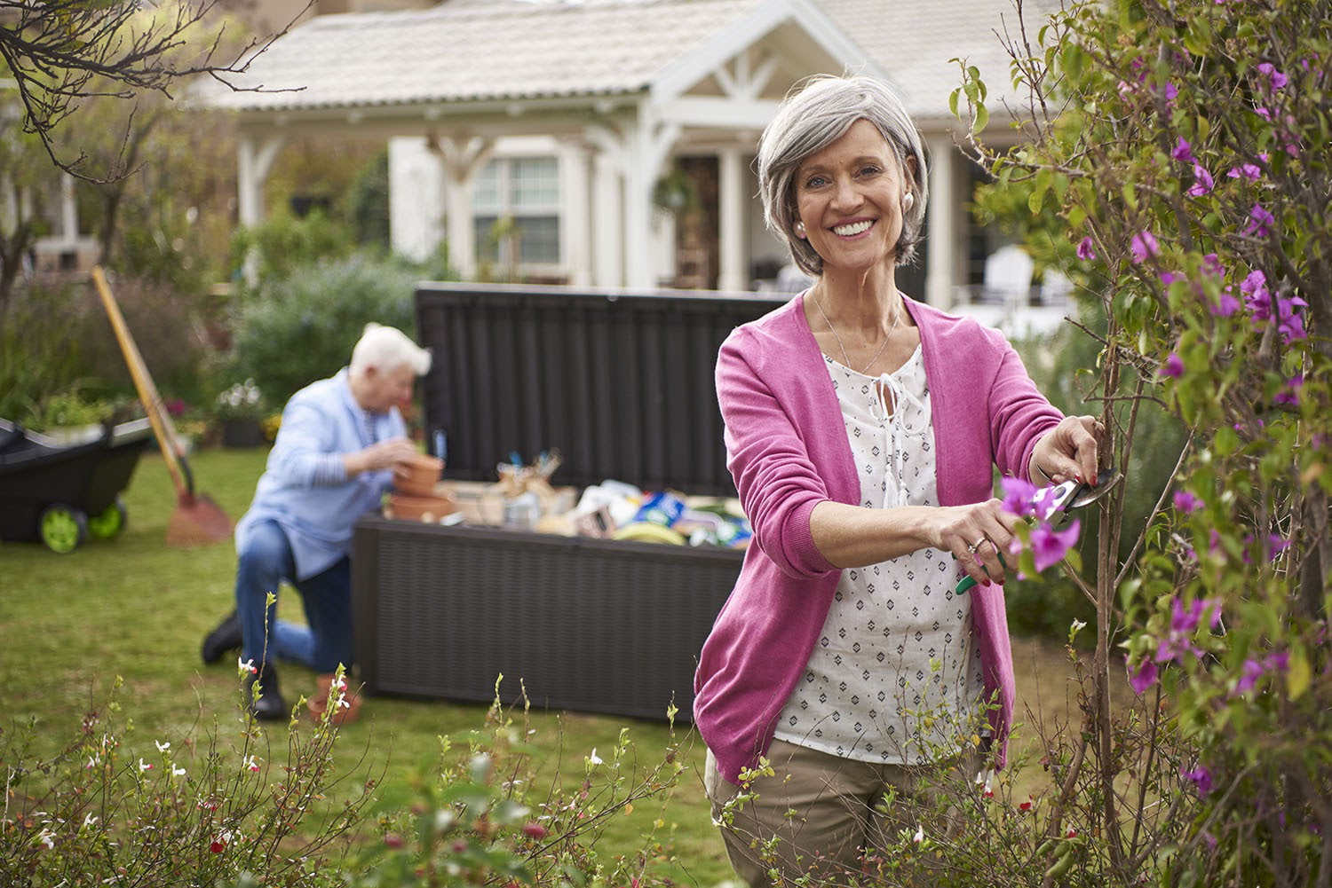 Suncast 73 Gallon Resin Deck Box with Seat. Light Taupe