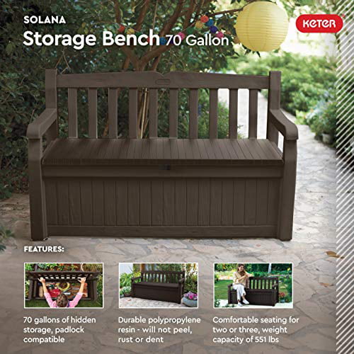 Keter Solana 70 Gallon Storage Bench Deck Box for Patio Furniture. Front Porch Decor and Outdoor Seating - Perfect to Store Garden Tools and Pool Toys. Brown