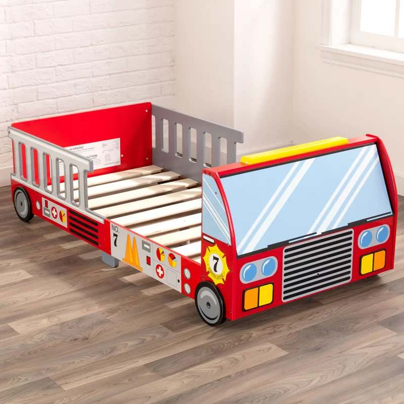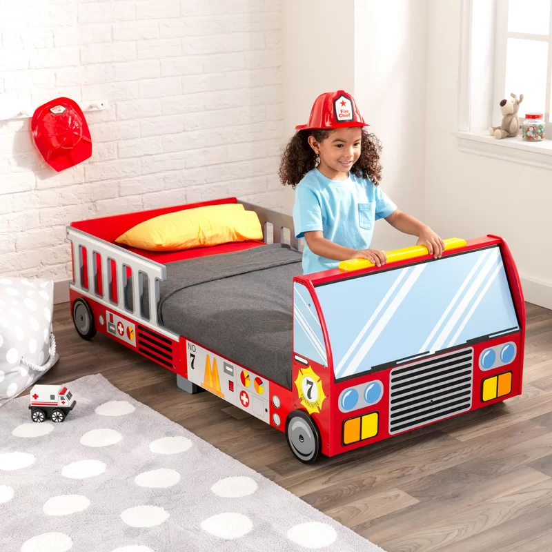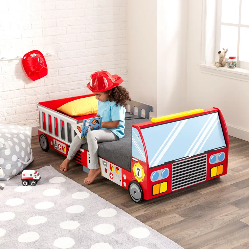 KidKraft Fire Truck Wooden Toddler Bed with Guard Rails. Children-s Furniture - Red. Gift for Ages 15 mo+