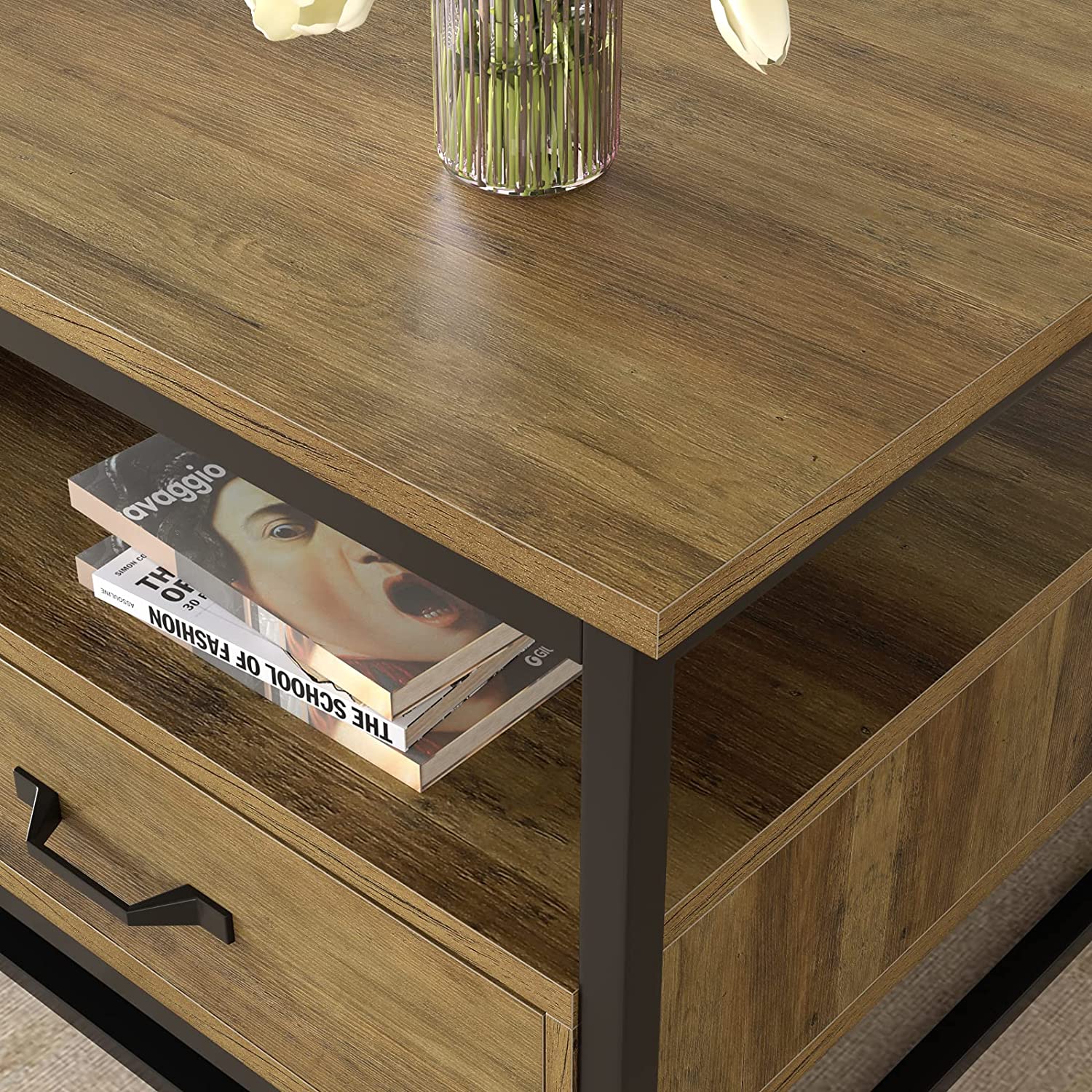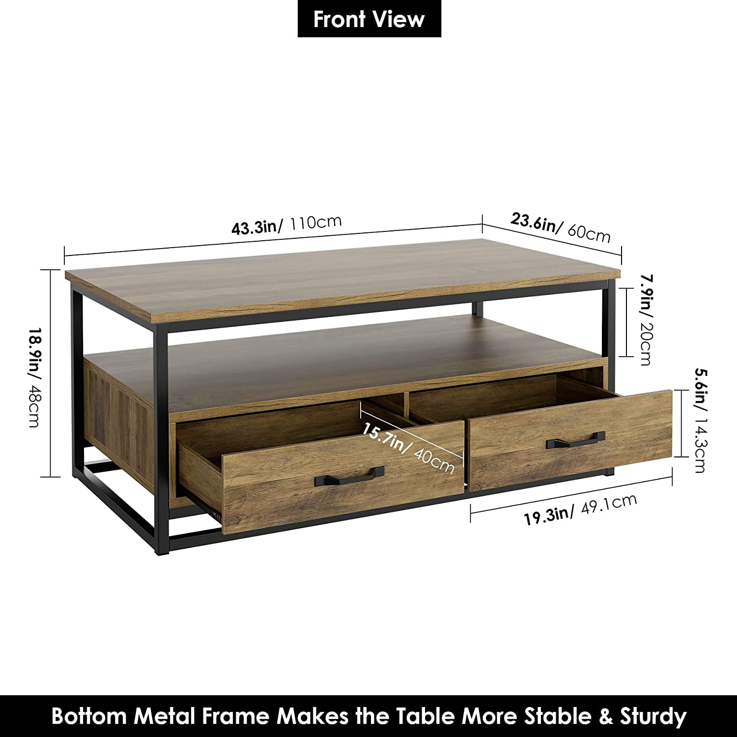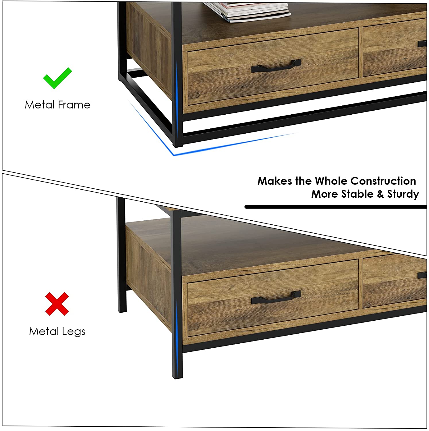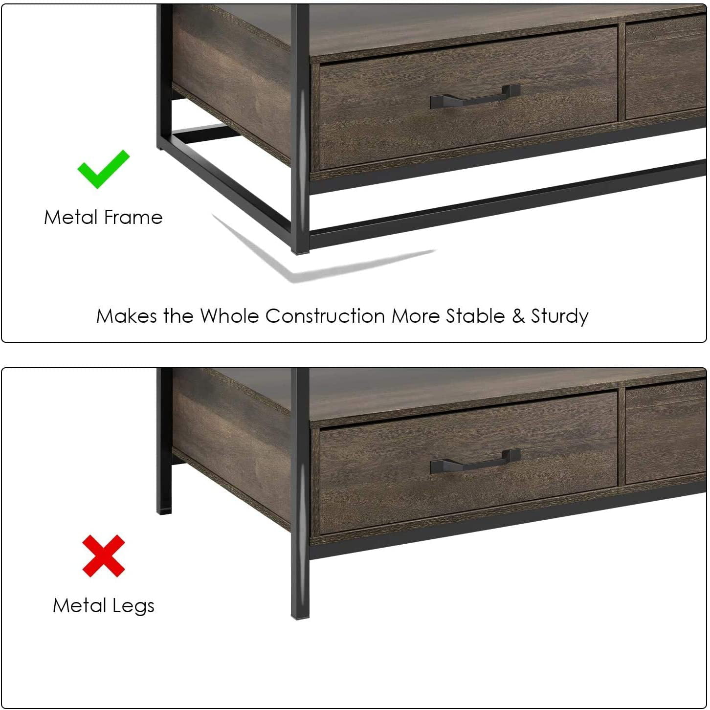 Homfa Coffee Table with Storage for Living Room. 43″ Wooden Center Table with Drawers. Low Frame Cocktail Table with 1 Shelf and 2 Drawers. Rustic Brown