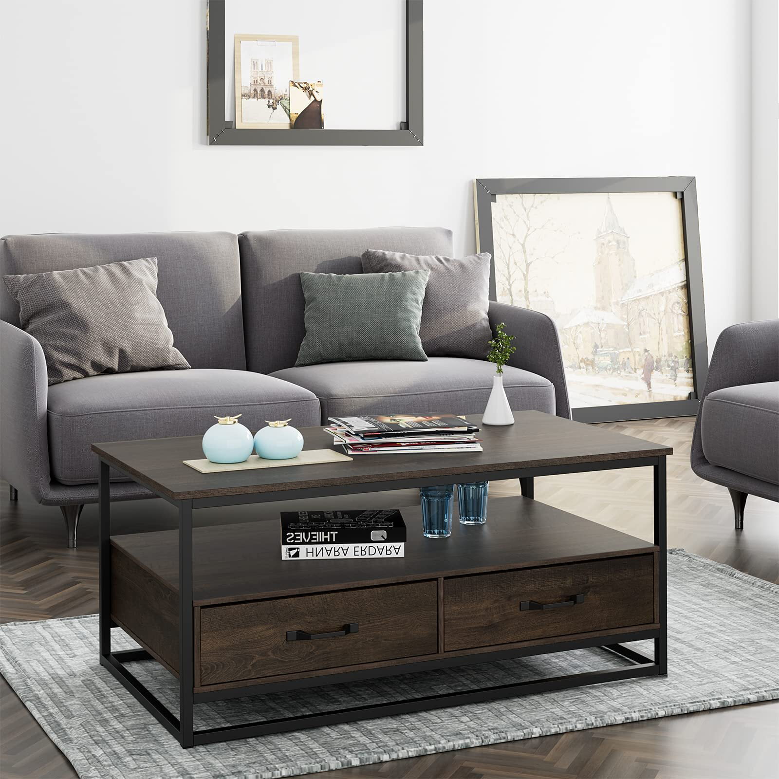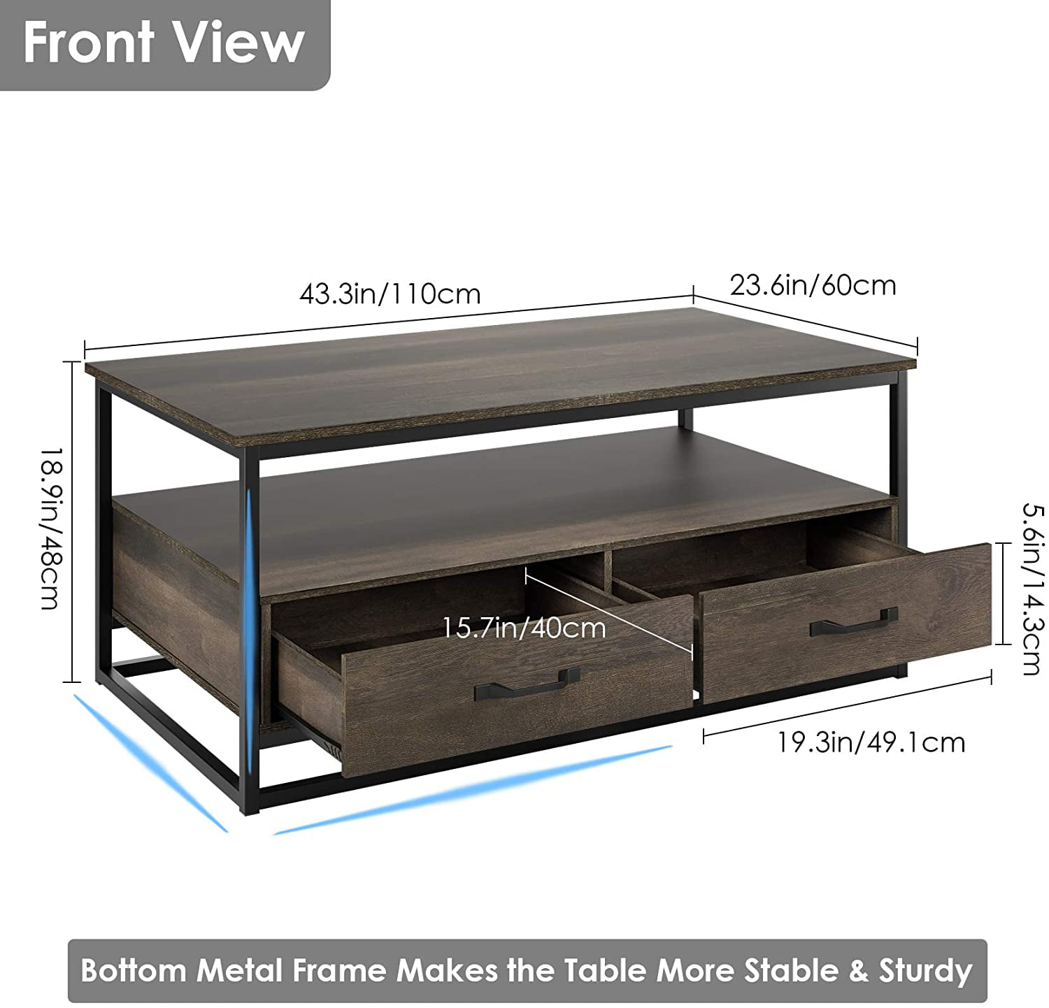 Homfa Coffee Table for Living Room. 43″” Wooden Cocktail Table with Storage Shelf and 2 Drawers. Rustic Center Table for Home Office. Dark Brown