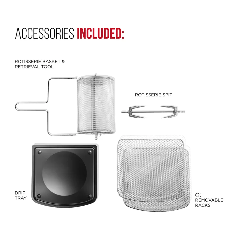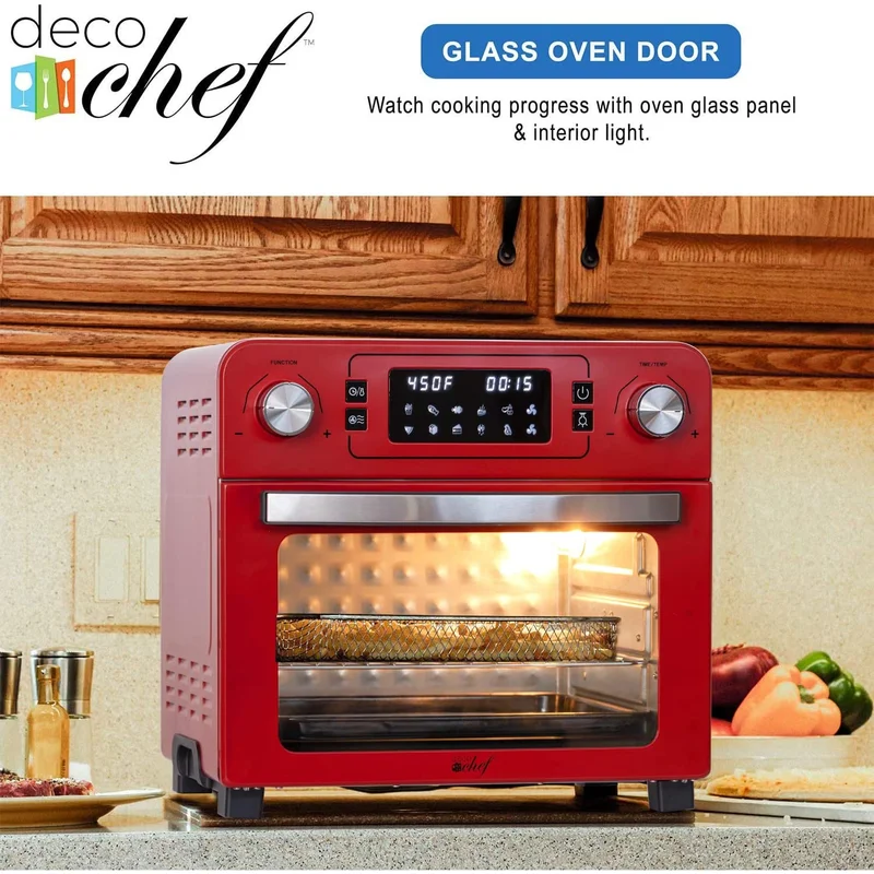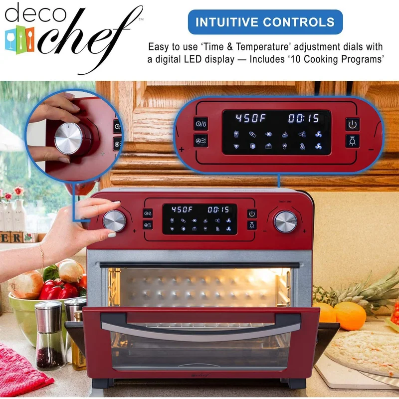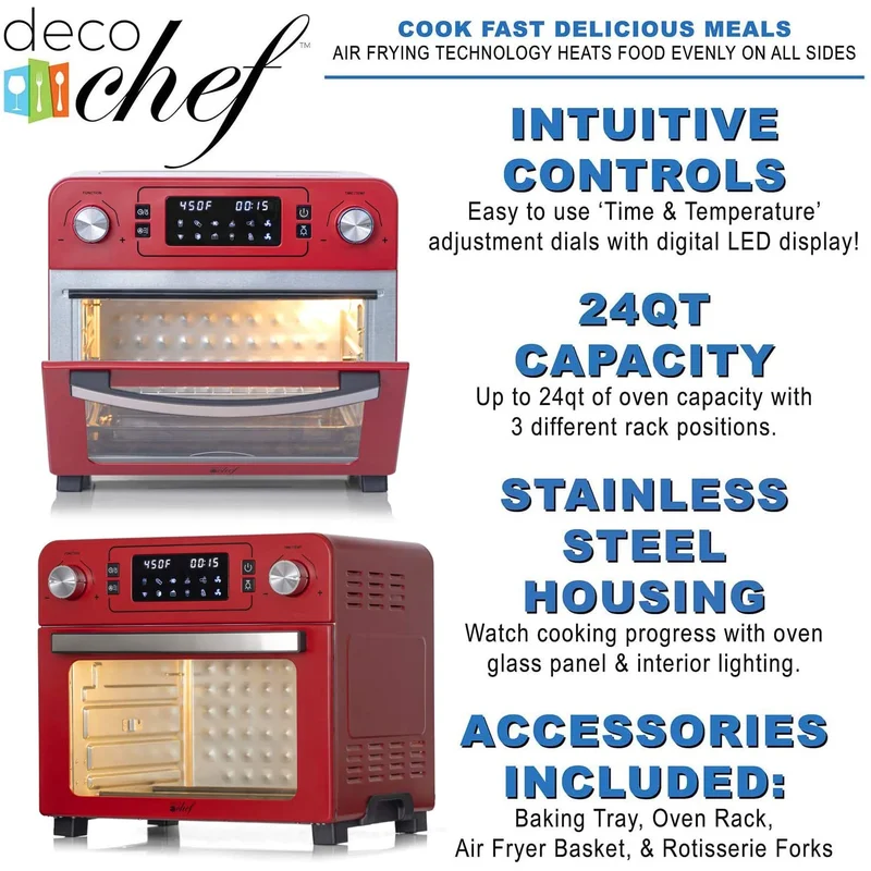 Deco Chef TQAIRRED 24 QT Red Stainless Steel Countertop 1700 Watt Toaster Oven with Built-in Air Fryer and Included Rotisserie Assembly. Grill Rack. Frying Basket. and Baking Pan