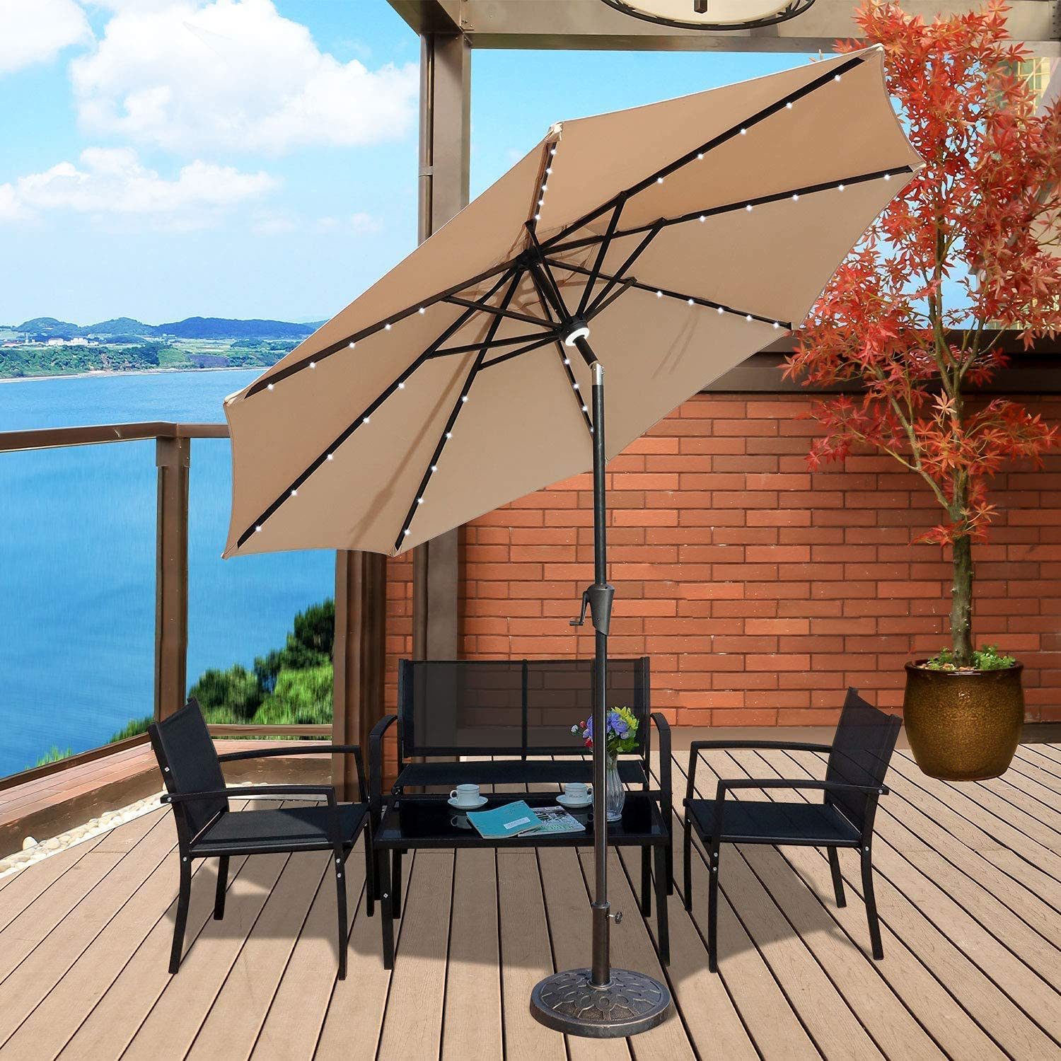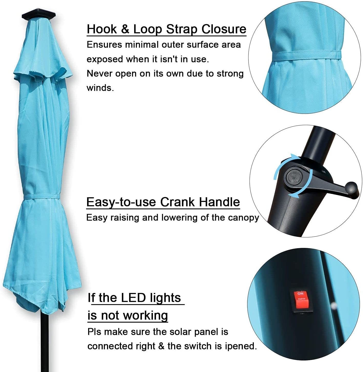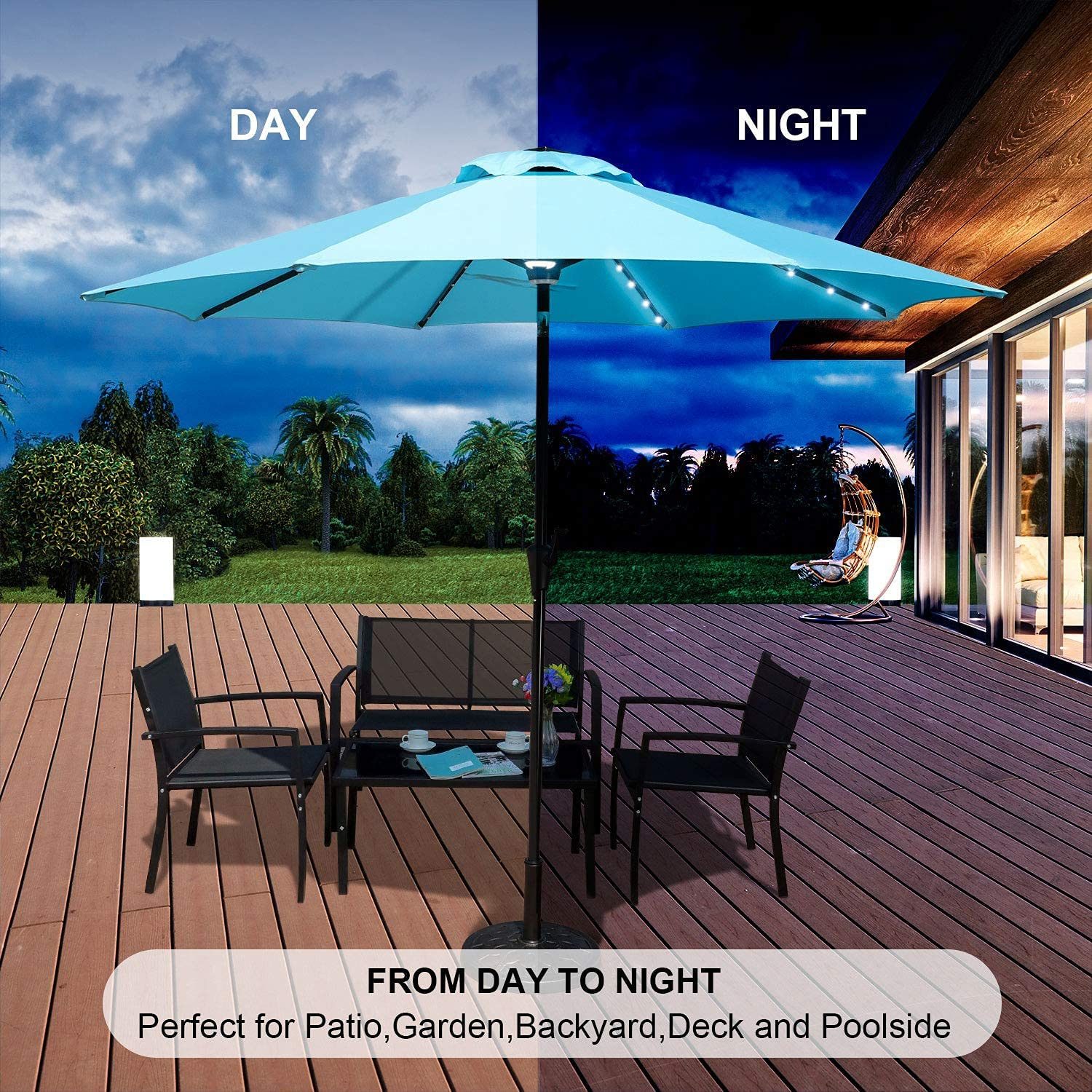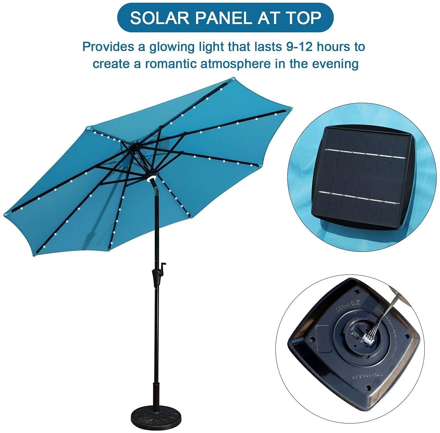 GOLDSUN Patio 9 Ft Market Outdoor Aluminum Table Umbrella with Solar LED Led lights and Push Button Tilt (Aqua blue)