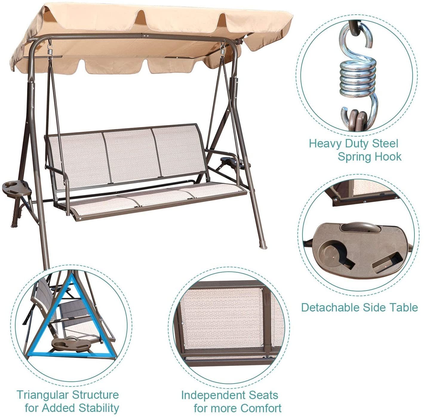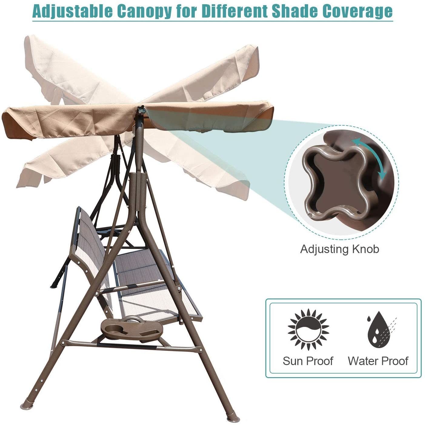GOLDSUN 3 Person Patio Swing Seat with Adjustable Canopy. All Weather Resistant Hammock Swinging Chair Bench for Patio. Garden. Poolside. Balcony (Taupe)
