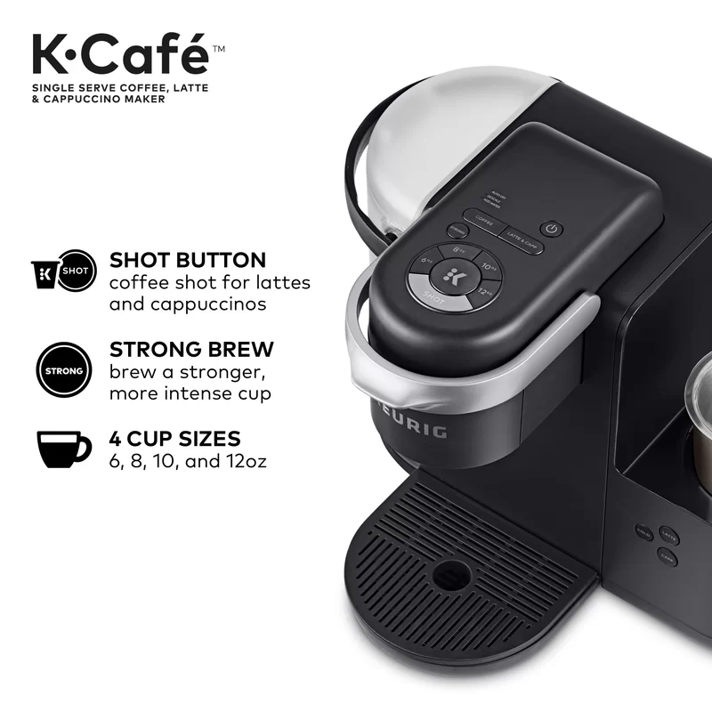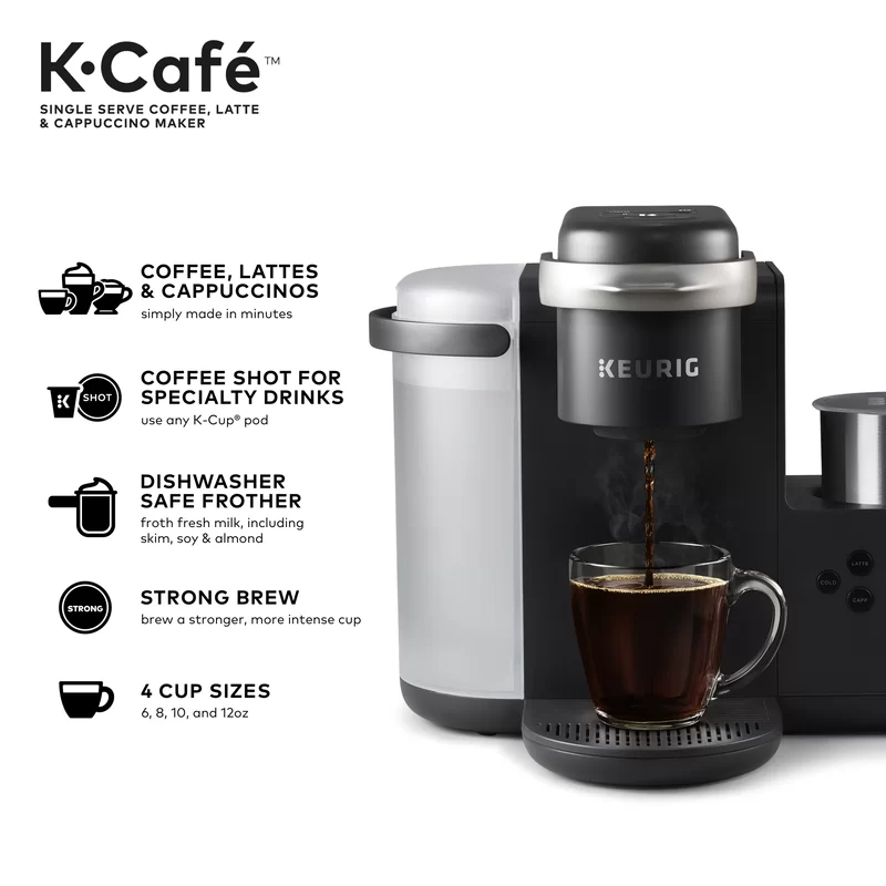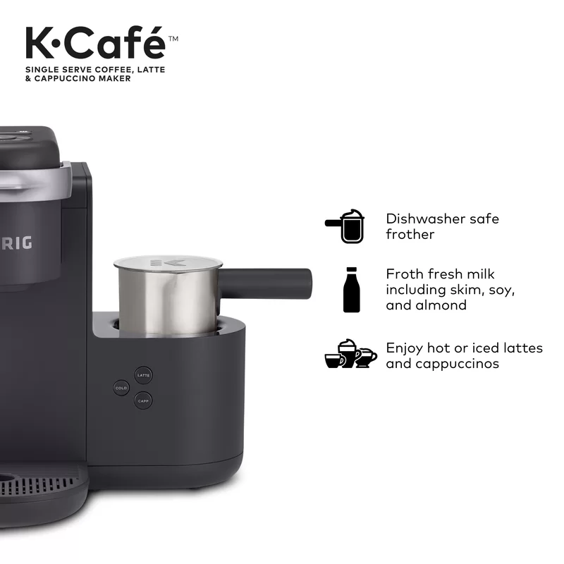 Keurig K-Cafe Single-Serve K-Cup Coffee Maker. Latte Maker and Cappuccino Maker. Comes with Dishwasher Safe Milk Frother. Coffee Shot Capability. Compatible With all Keurig K-Cup Pods. Dark Charcoal