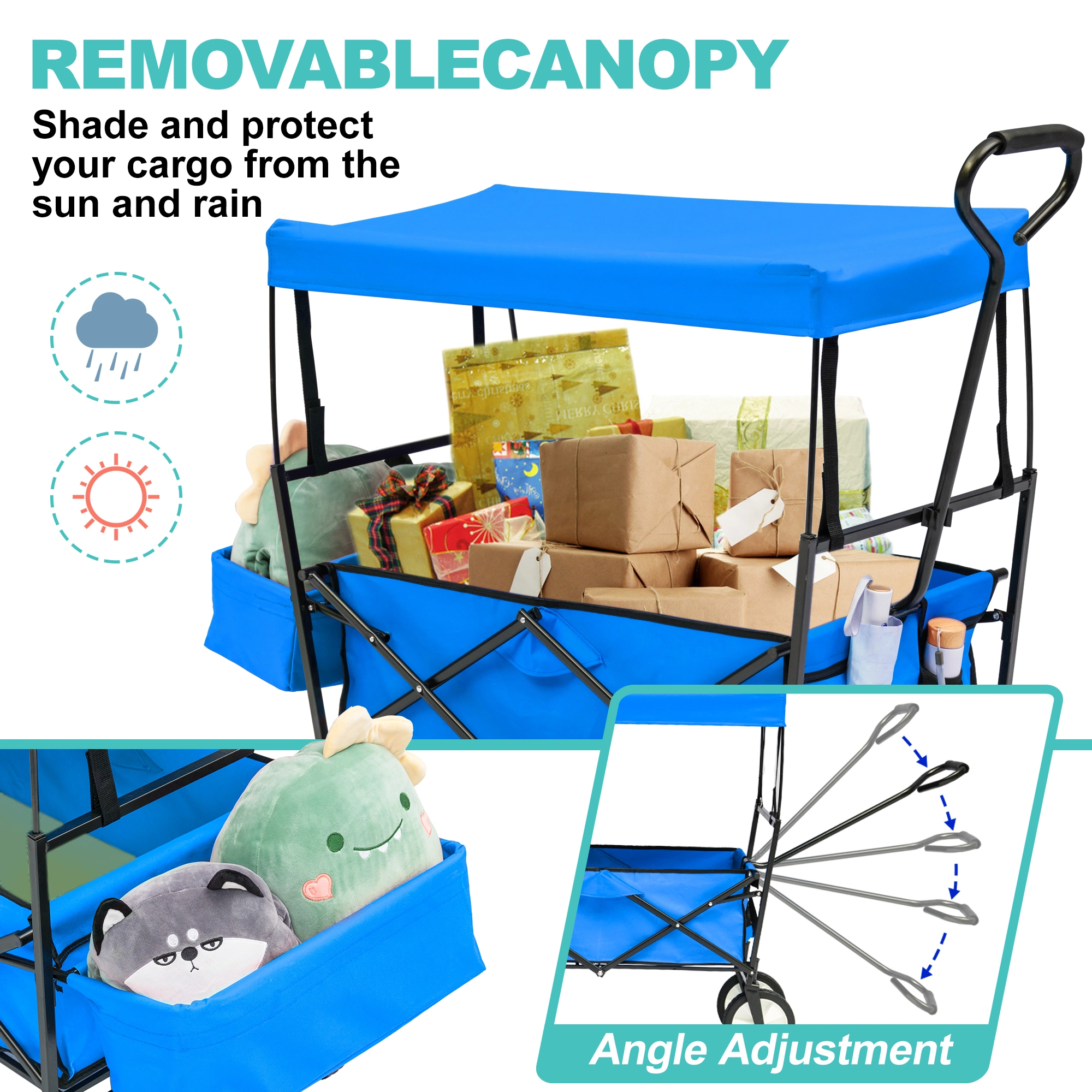 Collapsible Wagon Folding Cart with Canopy Beach Garden Outdoor Sport Utility Cart Wheels Adjustable Handle Rear Storage. Blue 49.2 x 20.5 x 45.27 inches