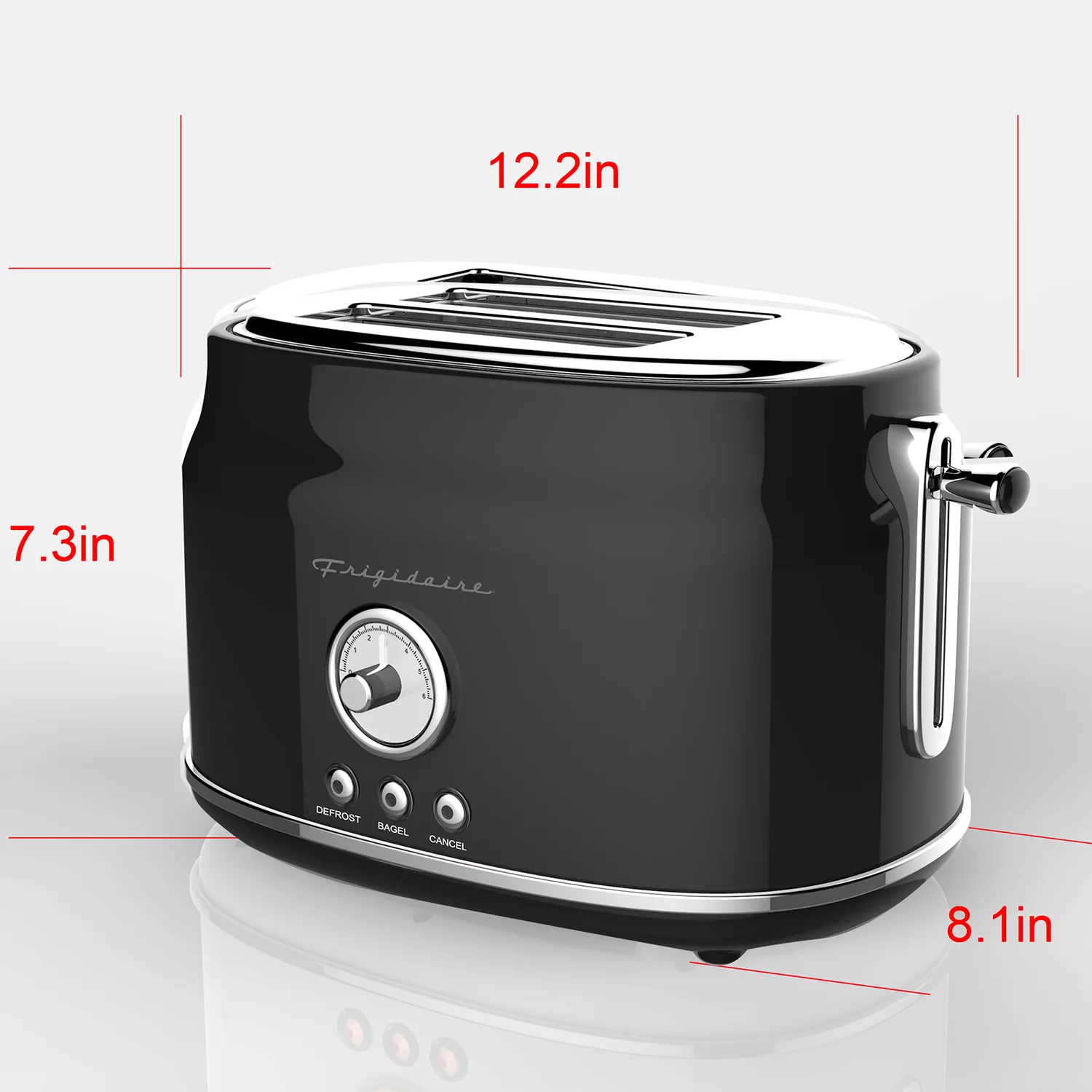 Frigidaire ETO102-BLACK. 2 Slice Toaster. Retro Style. Wide Slot for Bread. English Muffins. Croissants. and Bagels. 5 Adjustable Toast Settings. Cancel and Defrost. 900w. Black