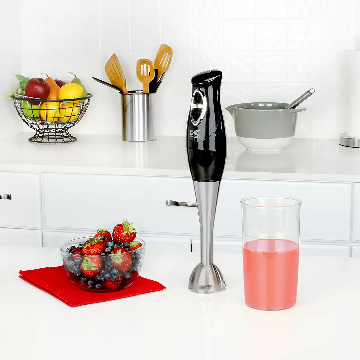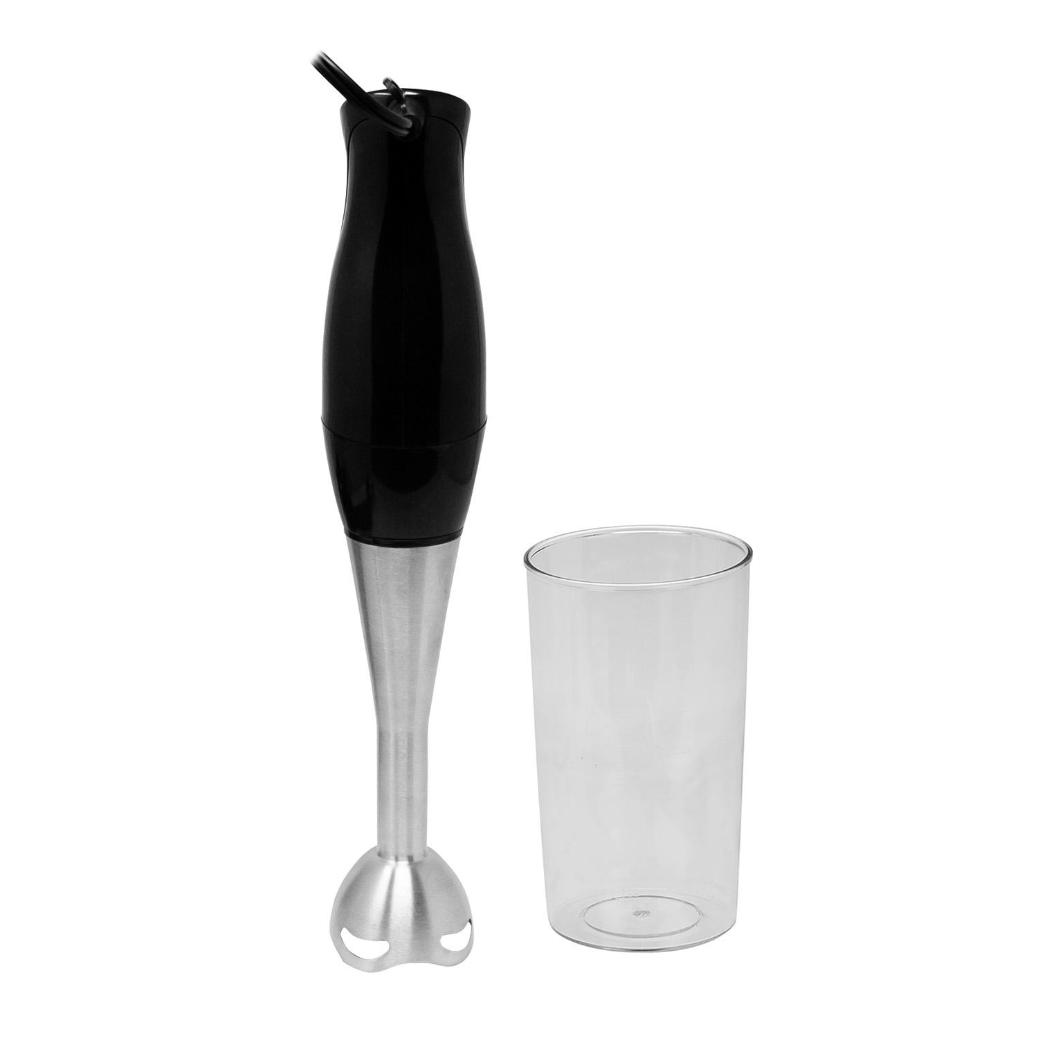 Kalorik Electronic Stick Mixer Dual Speed Control Settings. Stainless Steel Shaft and Blade .200 Watt Motor for Easy Mixing. 30 Fluid Ounce Mixing Cup