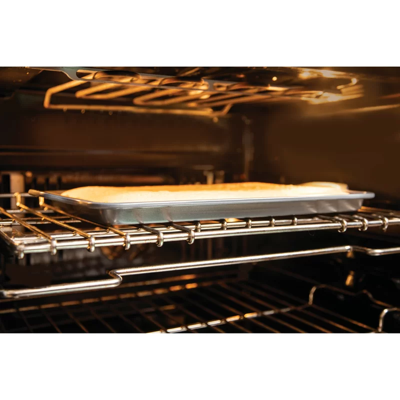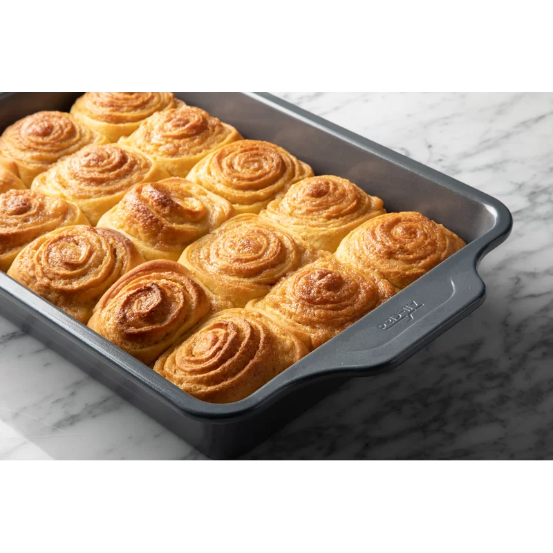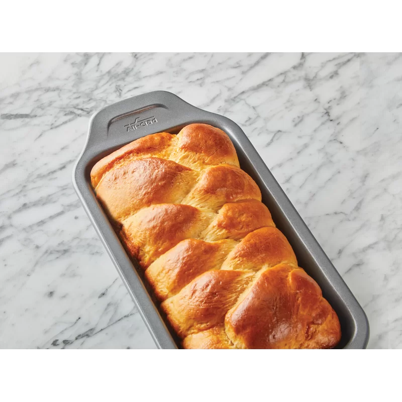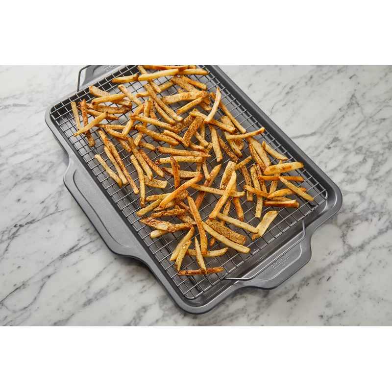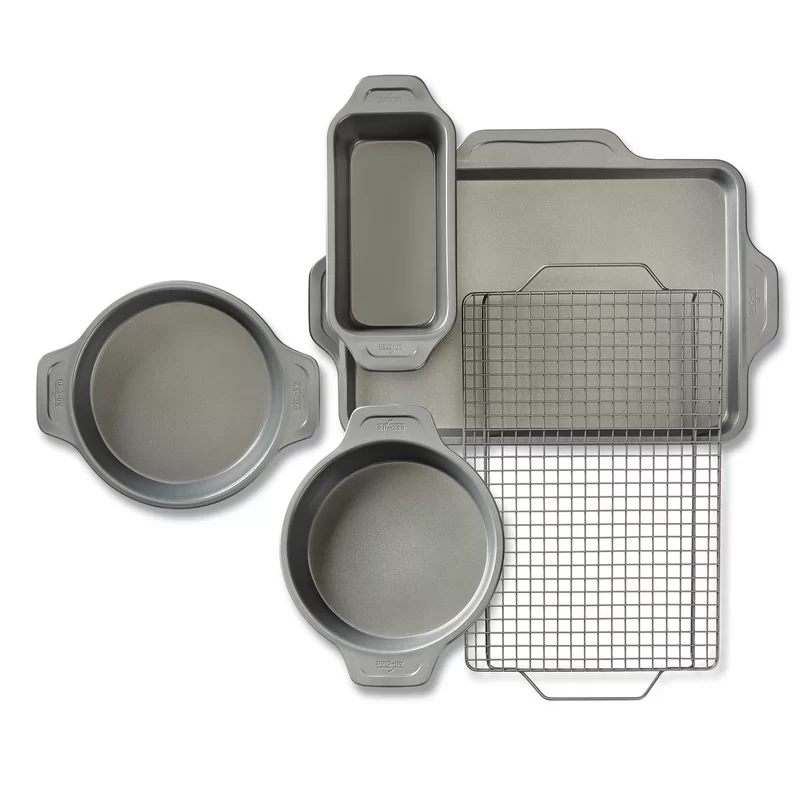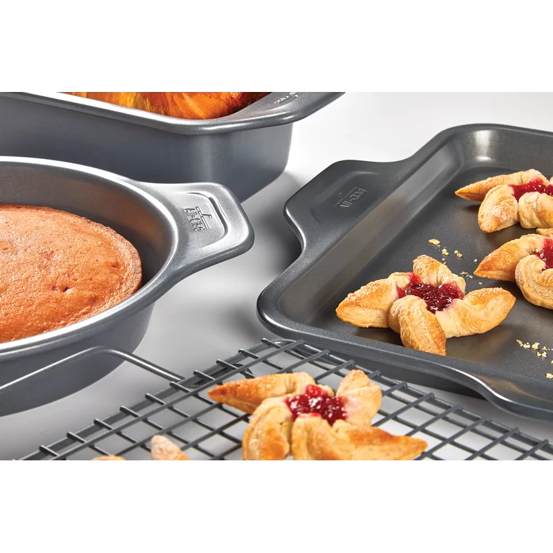 All-Clad J2575S64 Pro-Release Nonstick Bakeware Set including Half Sheet Pan. Cooling & Baking Rack. Round Cake Pan. Loaf Pan. 5 piece. Gray