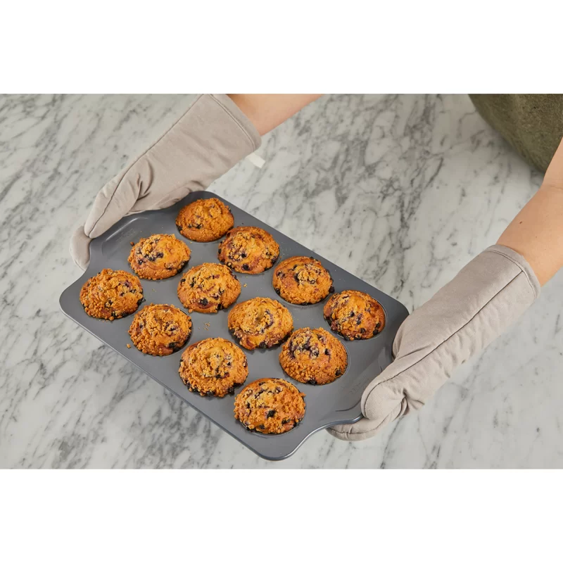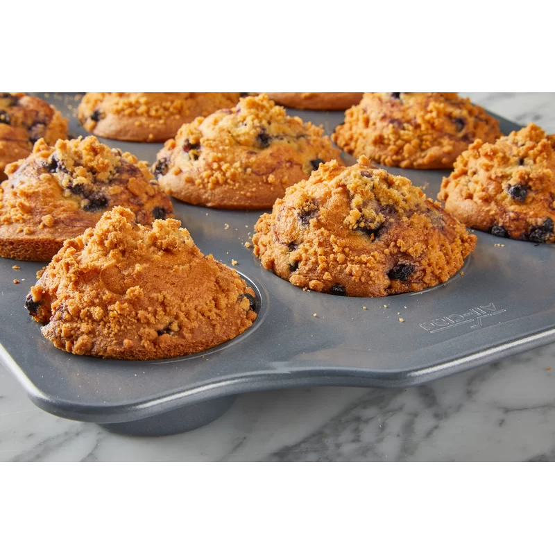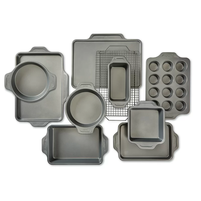 All-Clad J257SA64 Pro-Release Nonstick Bakeware Set including Half Sheet. Cookie Sheet. Muffin Pan. Cooling & Baking Rack. Round Cake Pan. Loaf Pan. 10 piece. Gray
