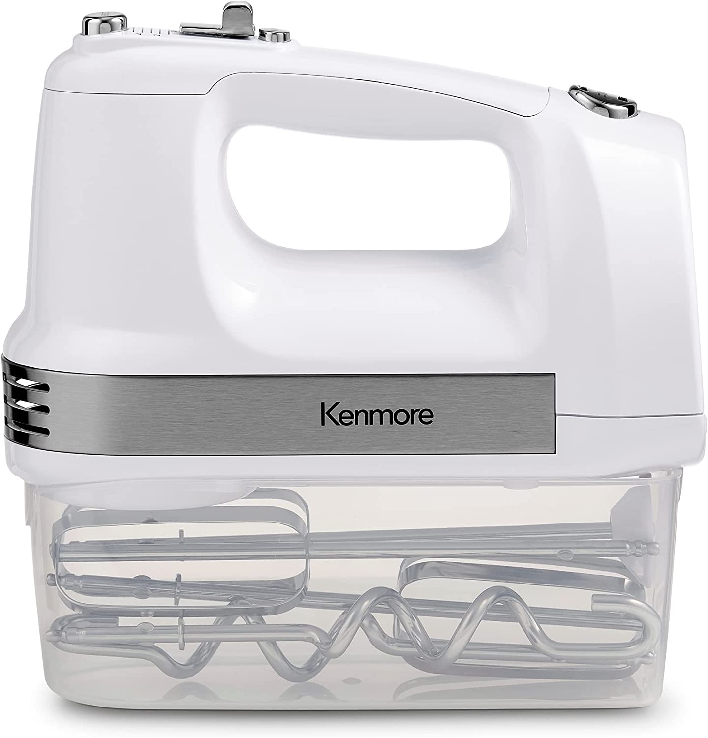 Kenmore 5-Speed Hand Mixer Beater Blender. 250 Watts. with Beaters. Dough Hooks. Liquid Blending Rod. Automatic Cord Retract. Burst Control. and Clip-On Accessory Storage