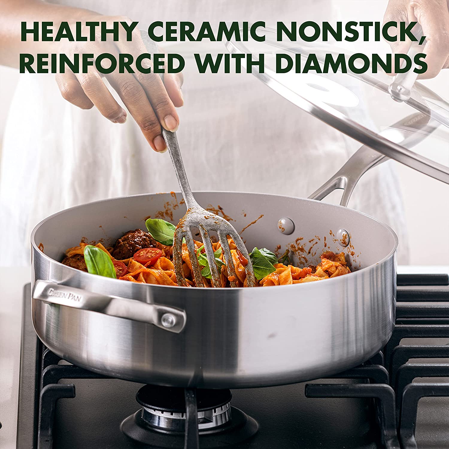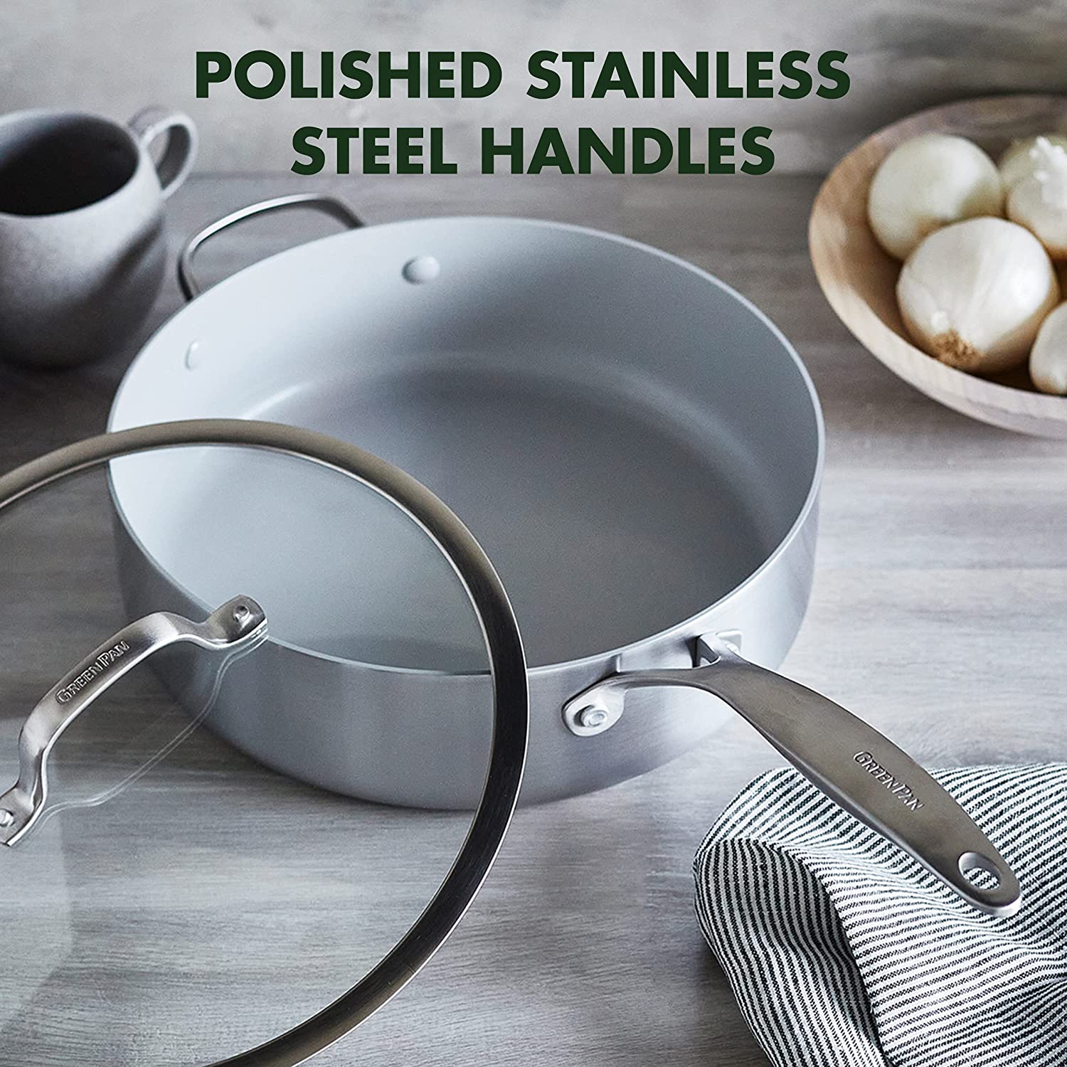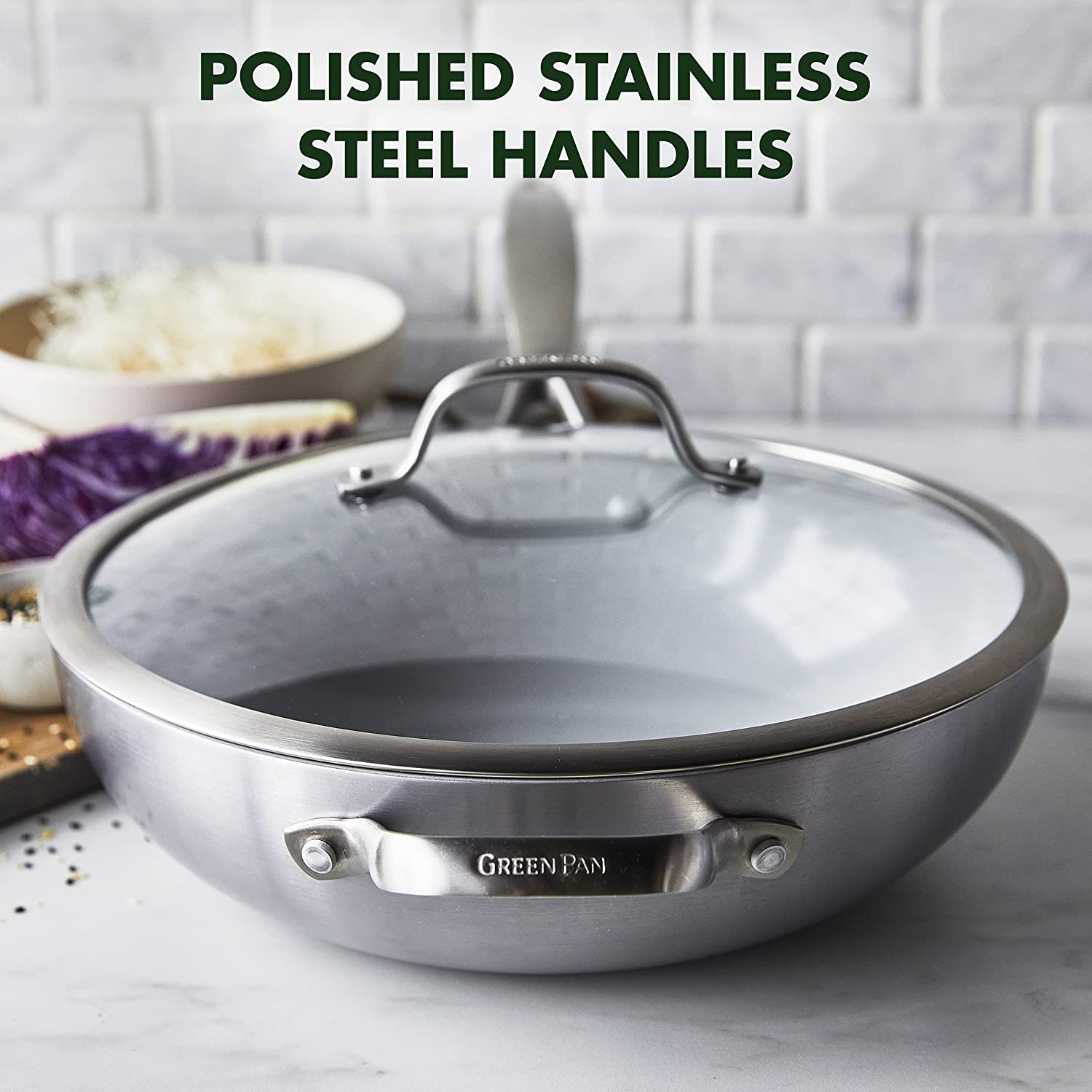 GreenPan Venice Pro Tri-Ply Stainless Steel Healthy Ceramic Nonstick 12″ Wok Pan with Helper Handle and Lid. PFAS-Free. Multi Clad. Induction. Dishwasher Safe. Oven Safe. Silver ( CC002258-001)