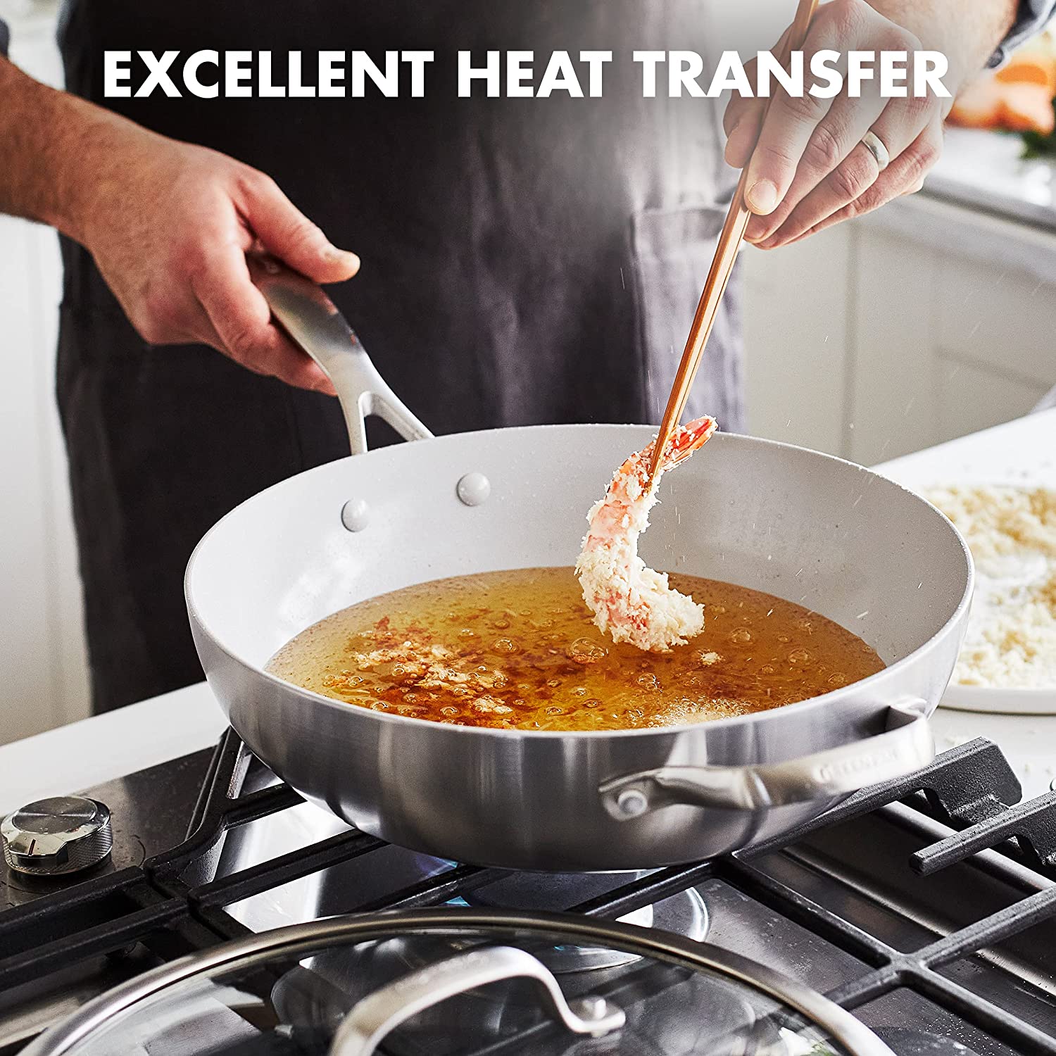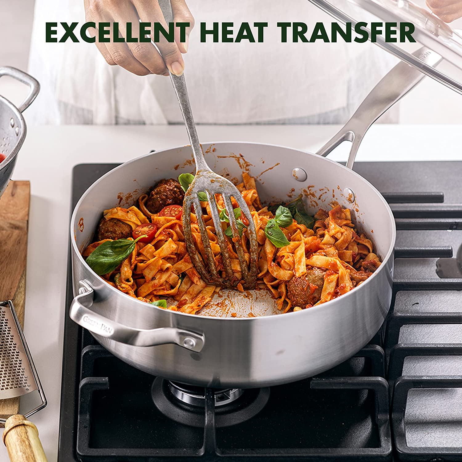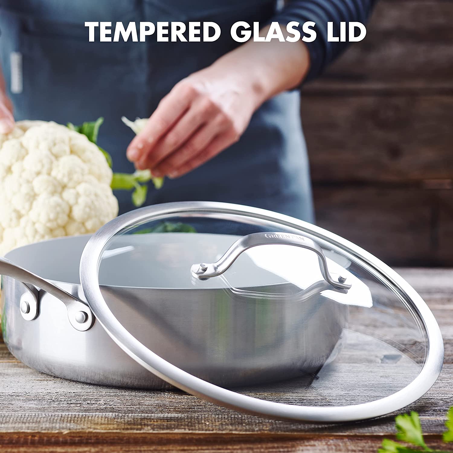 GreenPan Venice Pro Tri-Ply Stainless Steel Healthy Ceramic Nonstick 12″ Wok Pan with Helper Handle and Lid. PFAS-Free. Multi Clad. Induction. Dishwasher Safe. Oven Safe. Silver ( CC002258-001)