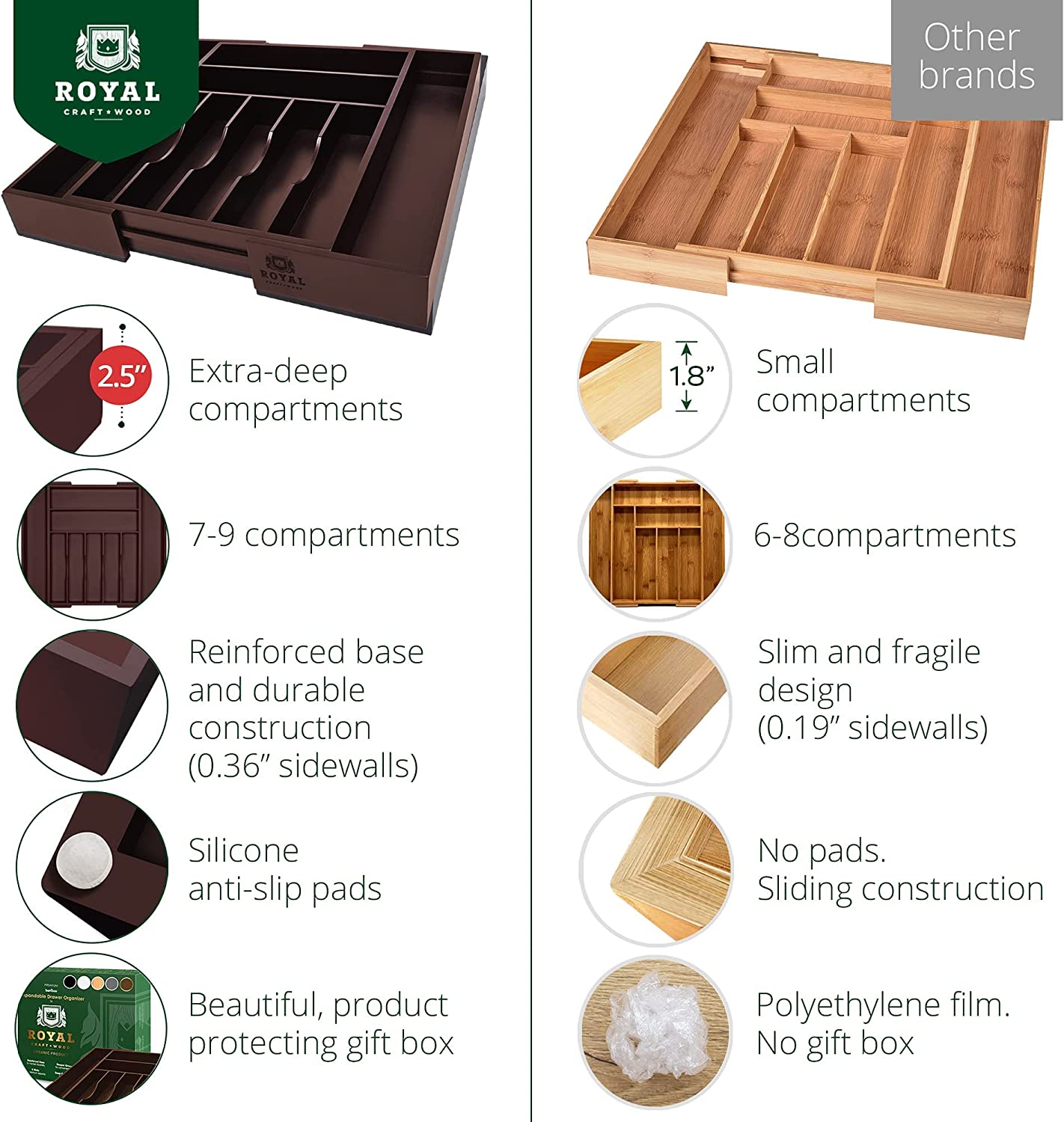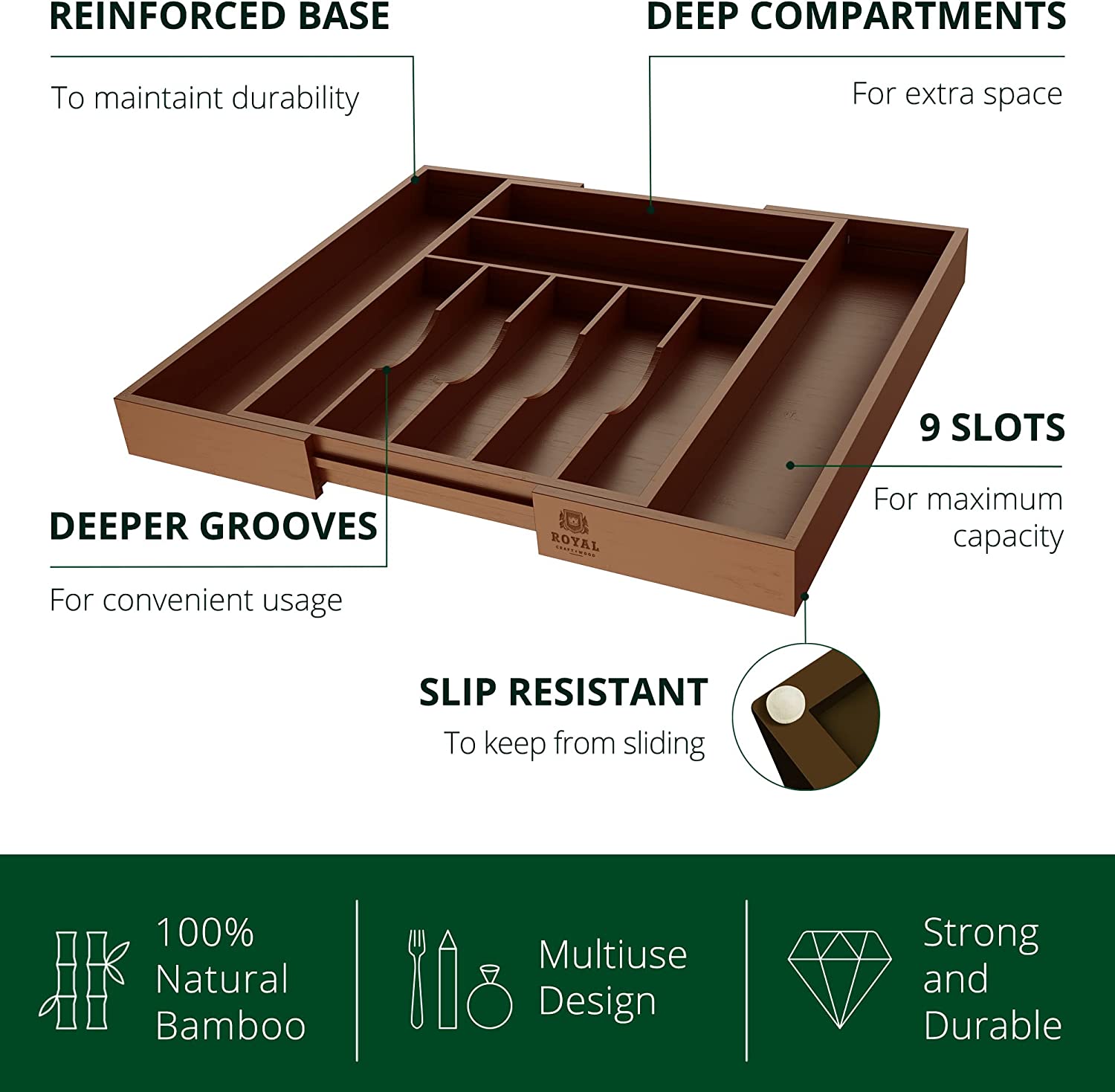Luxury Bamboo Kitchen Drawer Organizer - Silverware Organizer - Utensil Holder and Cutlery Tray (9 Slot. Brown)