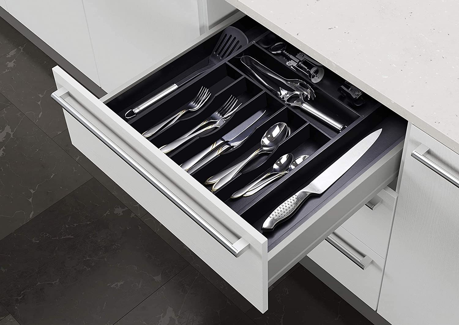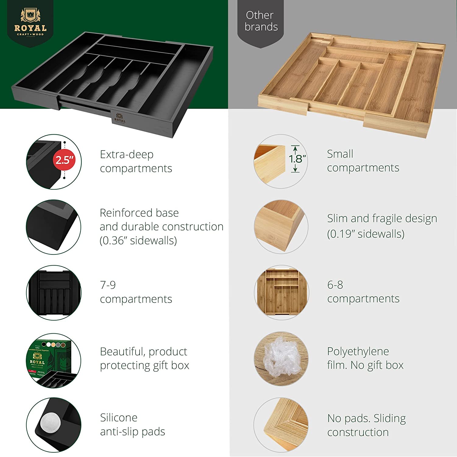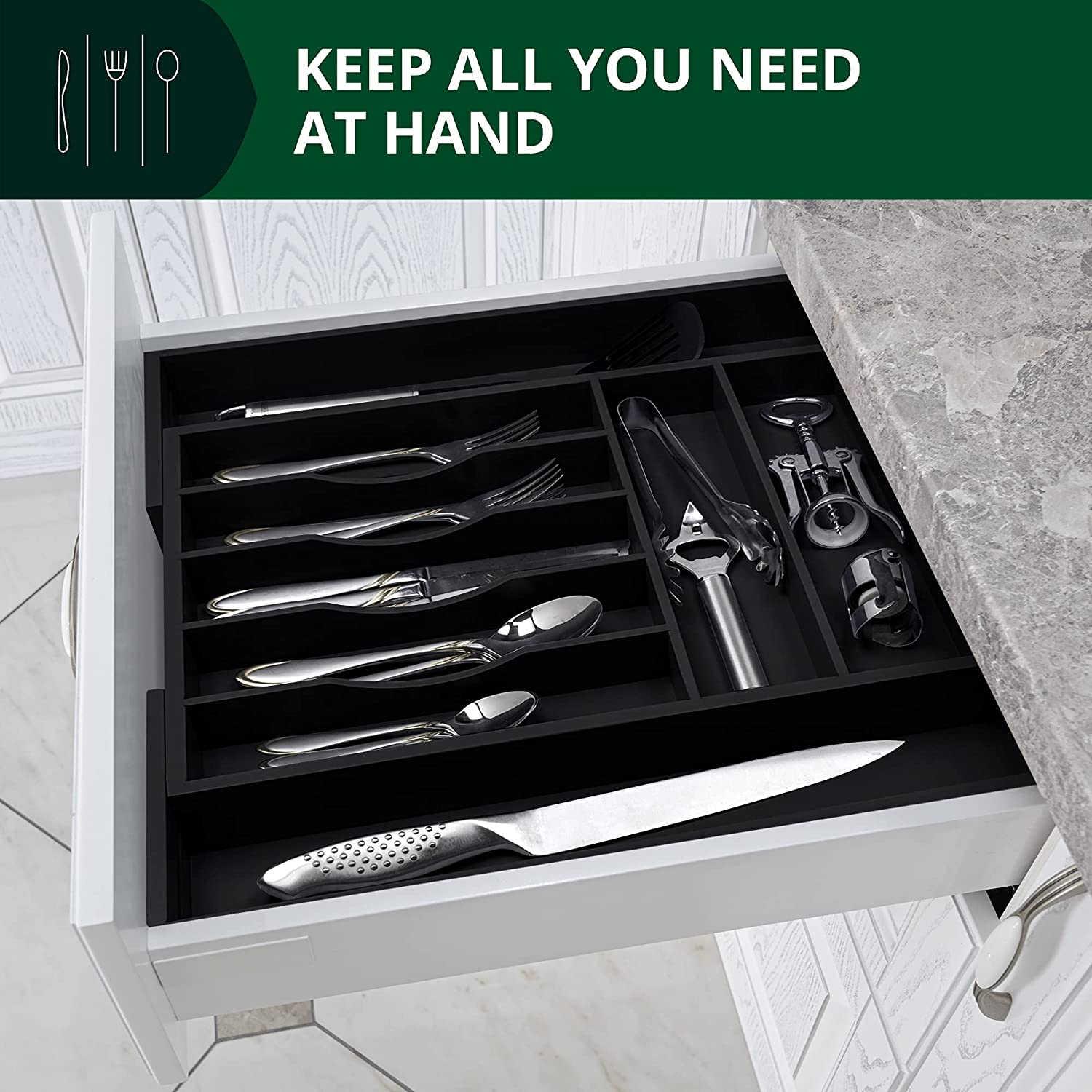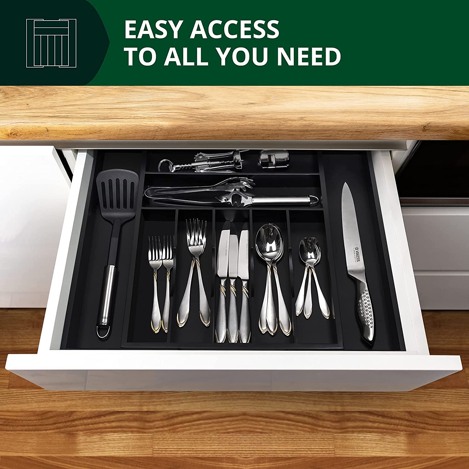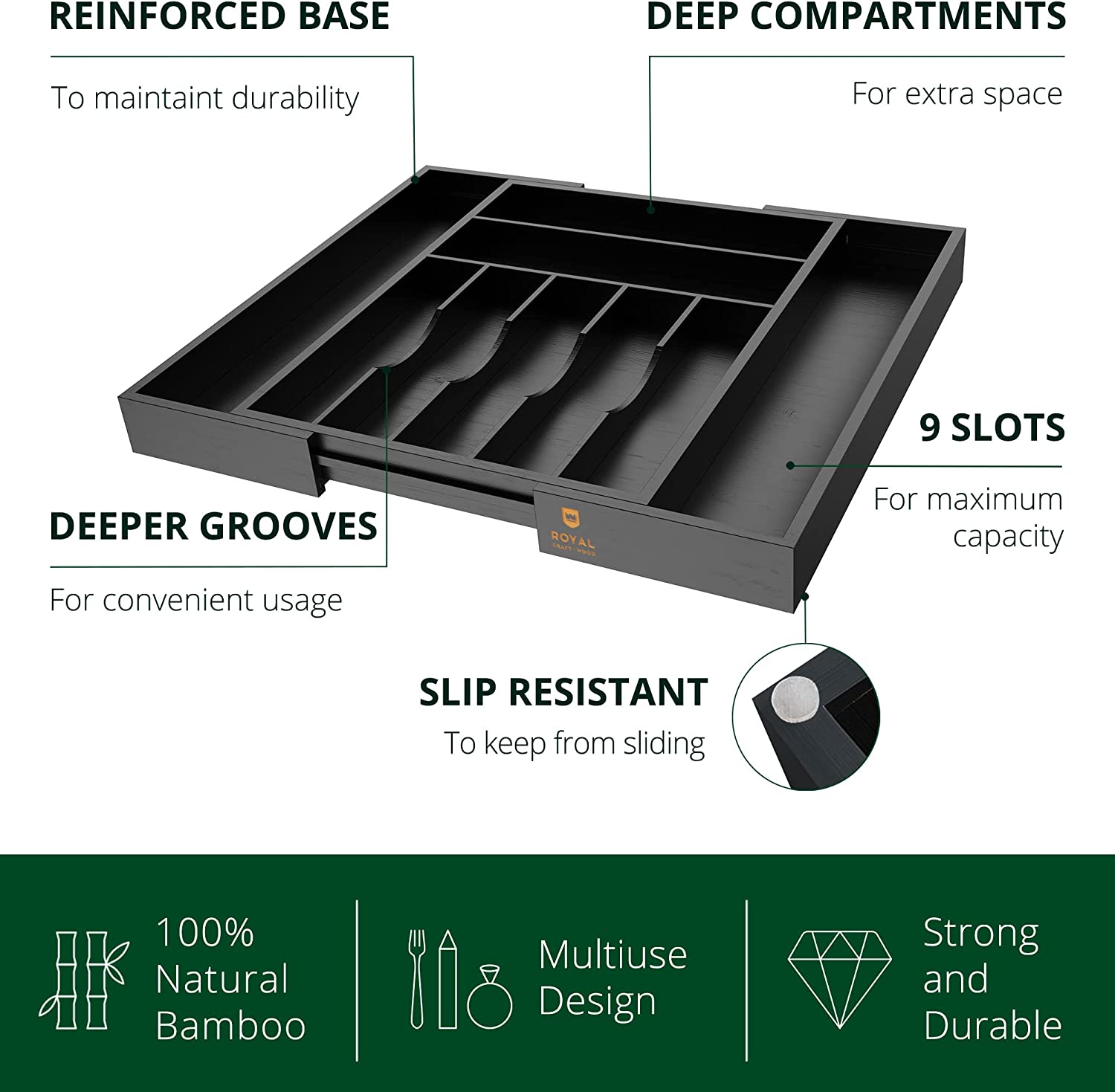 Luxury Bamboo Kitchen Drawer Organizer - Silverware Organizer - Utensil Holder and Cutlery Tray (9 Slot. Black)
