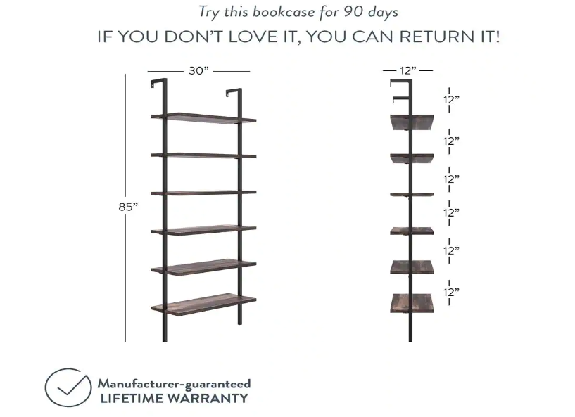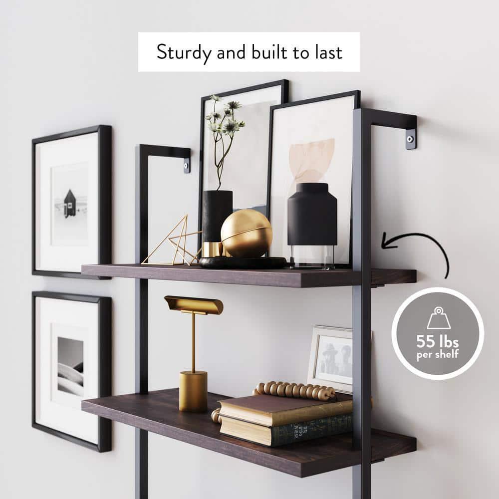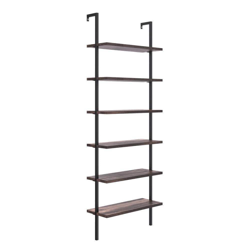 Nathan James Theo Nutmeg Brown Wood 6-Shelf Tall Ladder Bookcase Wall Mount Bookshelf Matte Black Metal Frame