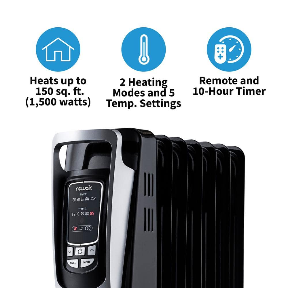 NewAir AH-450B Portable1500-Watt Electric Oil-Filled Silent Radiator Heater with Energy Efficient Operation Cover 150 sq. ft. - Black