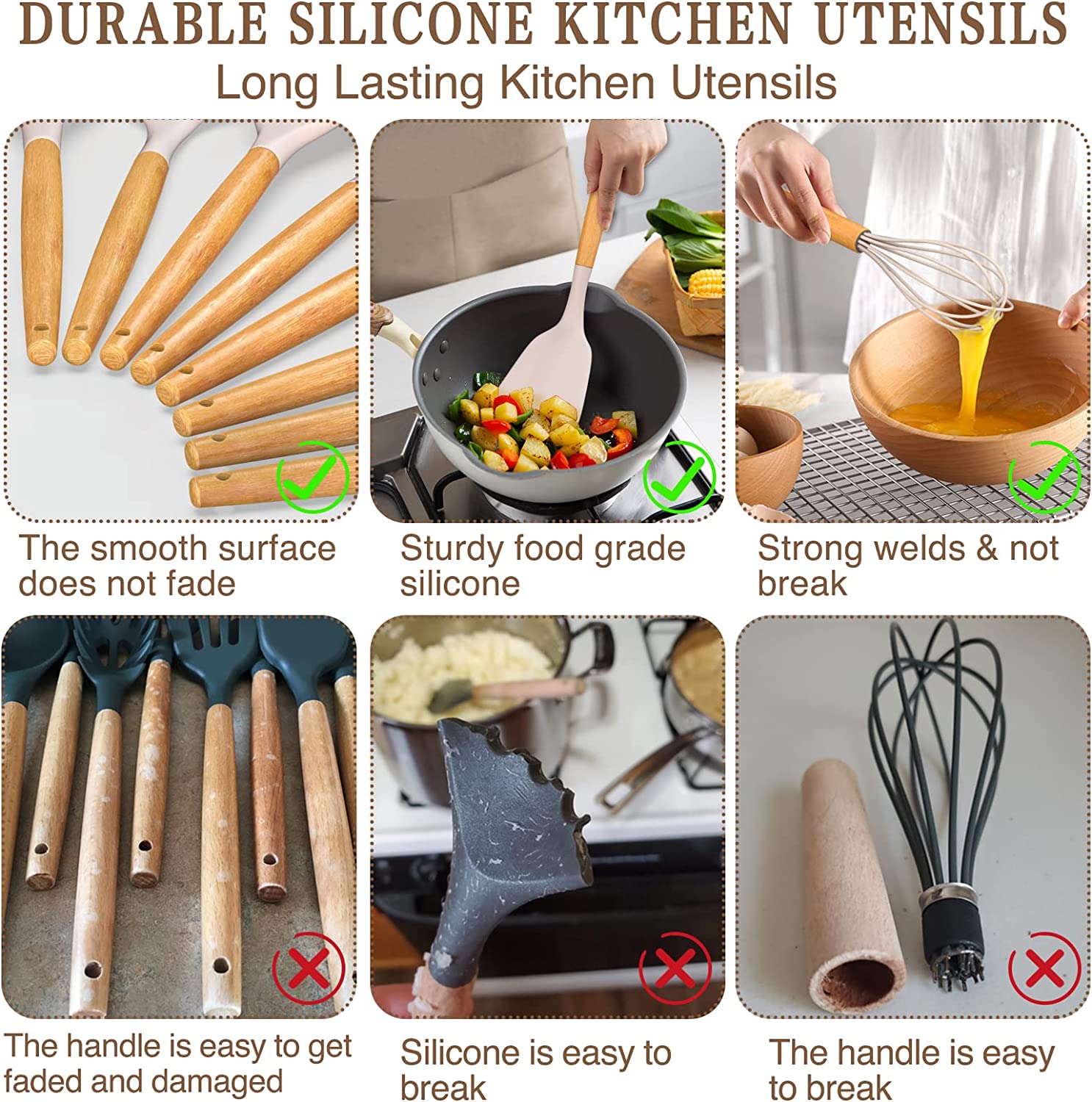 Umite Chef Kitchen Cooking Utensils Set. 33 pcs Non-Stick Silicone Cooking Kitchen Utensils Spatula Set with Holder. Wooden Handle Silicone Kitchen Gadgets Utensil Set (Khaki)