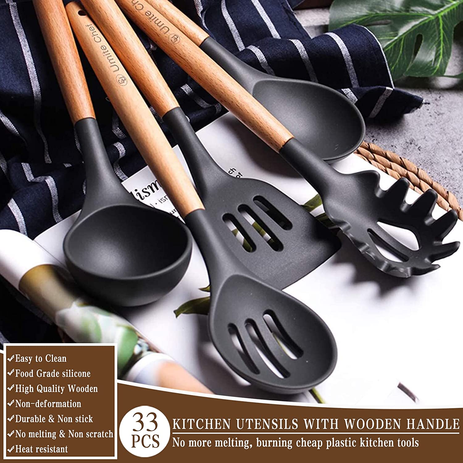Umite Chef Kitchen Cooking Utensils Set. 33 pcs Non-Stick Silicone Cooking Kitchen Utensils Spatula Set with Holder. Black Wooden Handle Silicone Kitchen Gadgets Utensil Set