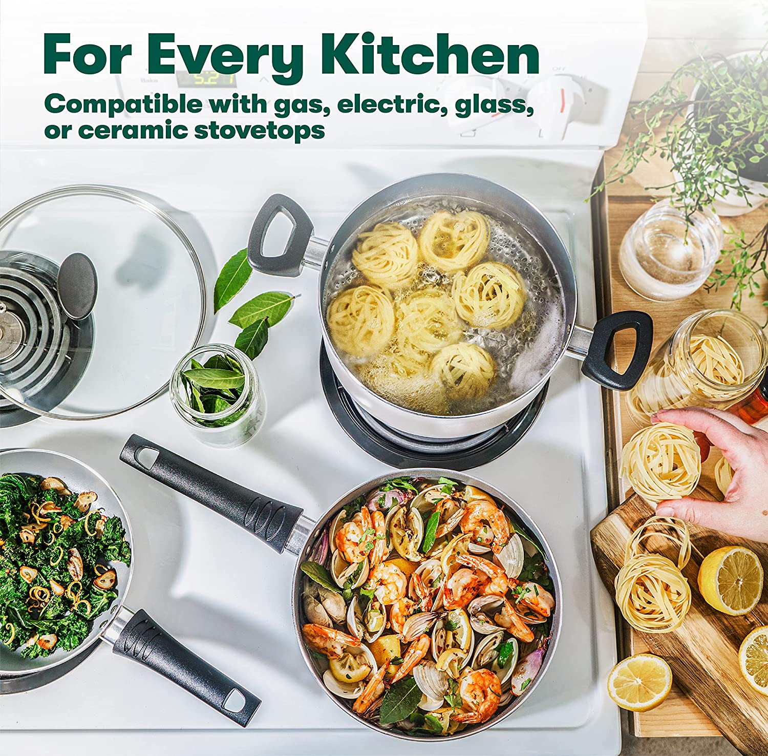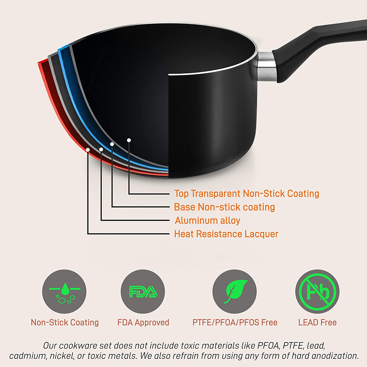 NutriChef 13-Piece Nonstick Cookware PTFE/PFOA/PFOS Free Heat Resistant Kitchen Ware Set w/Saucepan. Frying Pans. Cooking Pots. Casserole. Lids. Ladle. Fork. Strainer NCCWA13. Black