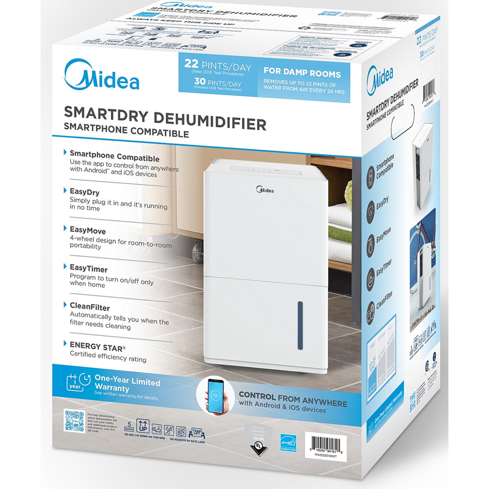 Midea 22-Pint Energy Star Smart Dehumidifier for Damp Rooms. White. MAD22S1WWT