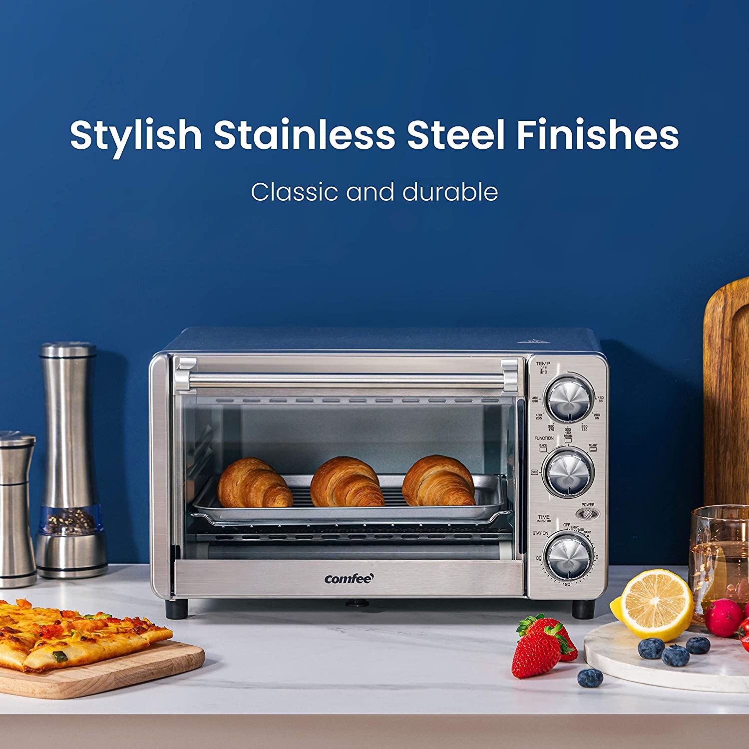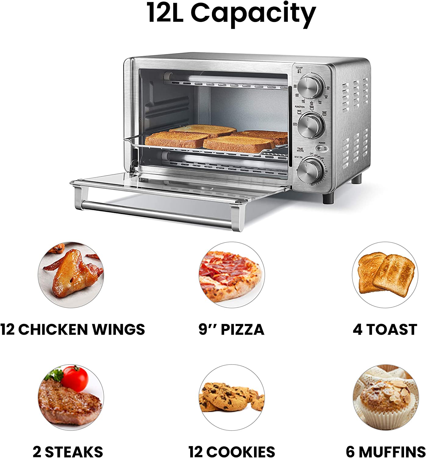 COMFEE- 4 Slice Small Toaster Oven Countertop. 12L with 30-Minute Timer. 3-In-One. Bake. Broil. Toast. 1100 Watts. Dual heating element. Stainless Steel(CFO-BG12(SS))