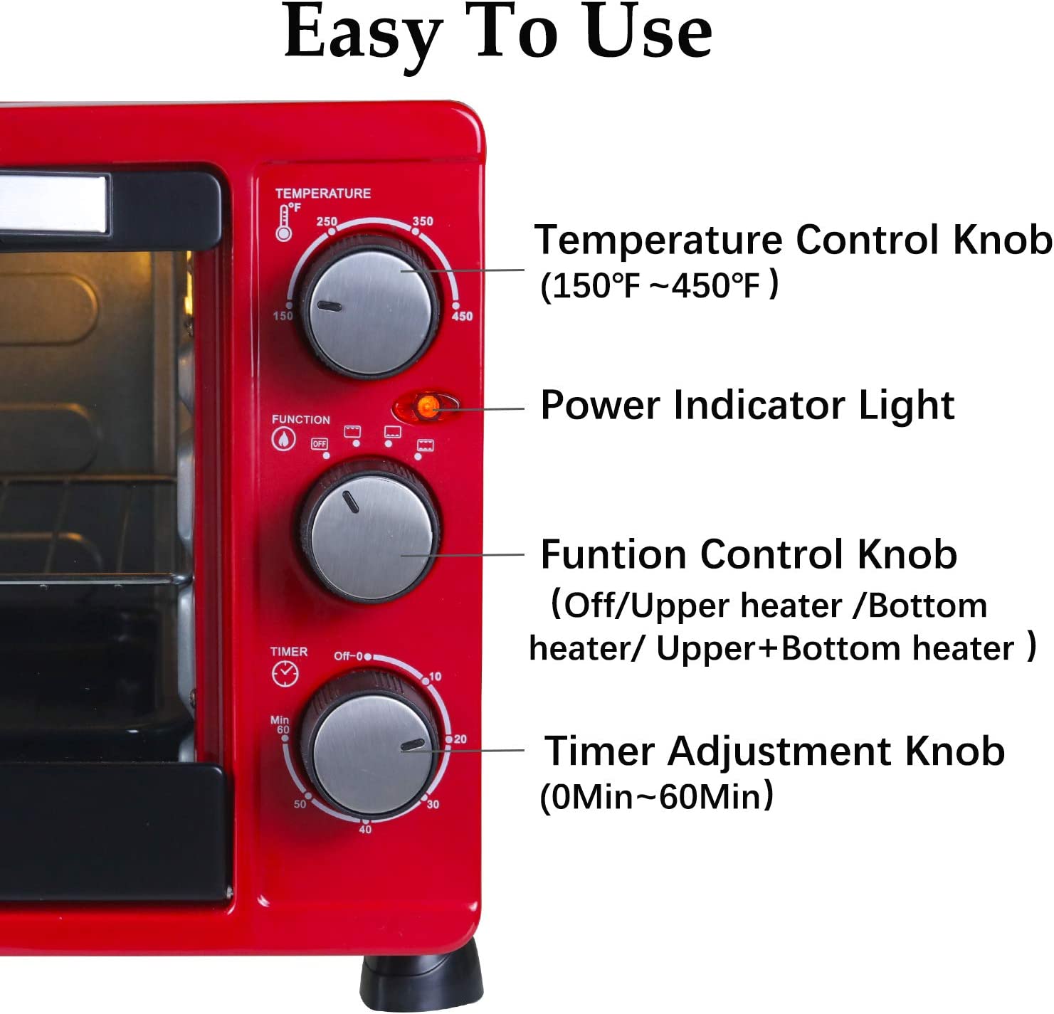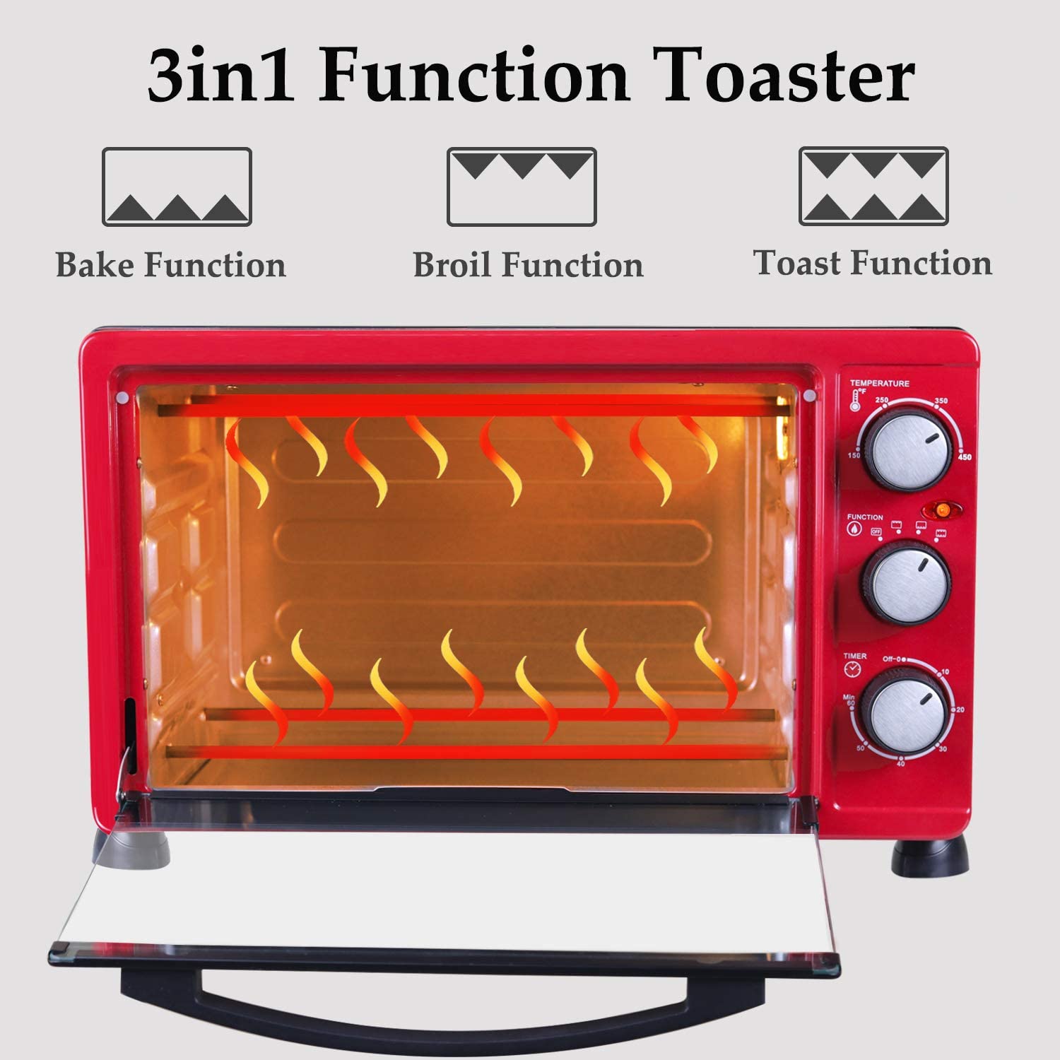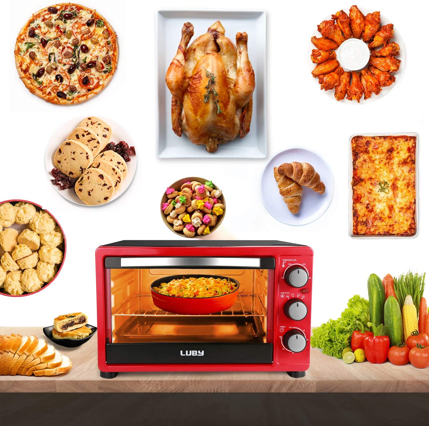 LUBY Convection Toaster Oven with Timer. Toast. Broil Settings. Includes Baking Pan. Rack and Crumb Tray. 6-Slice. Red